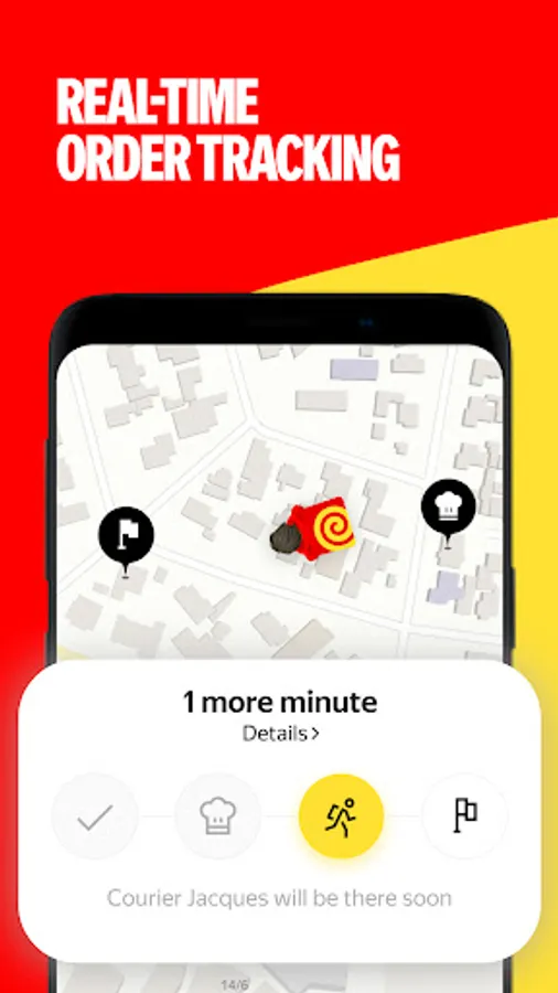 Enter the delivery address — we will find the nearest store or restaurant to you and deliver the order as quickly as possible. On average food is delivered in 32 minutes after placing an order — even faster than you would get ready to go shopping.