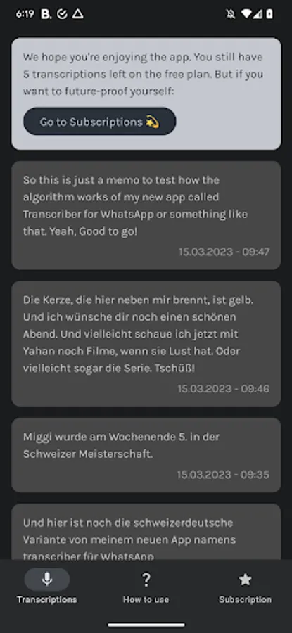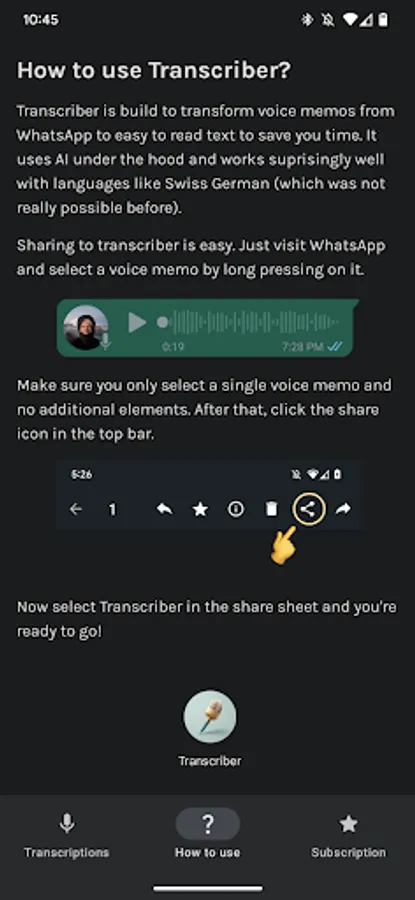 Transcribe your long voice memos to text in no time at all, using AI technology. It even works with languages like Swiss German (Beta).