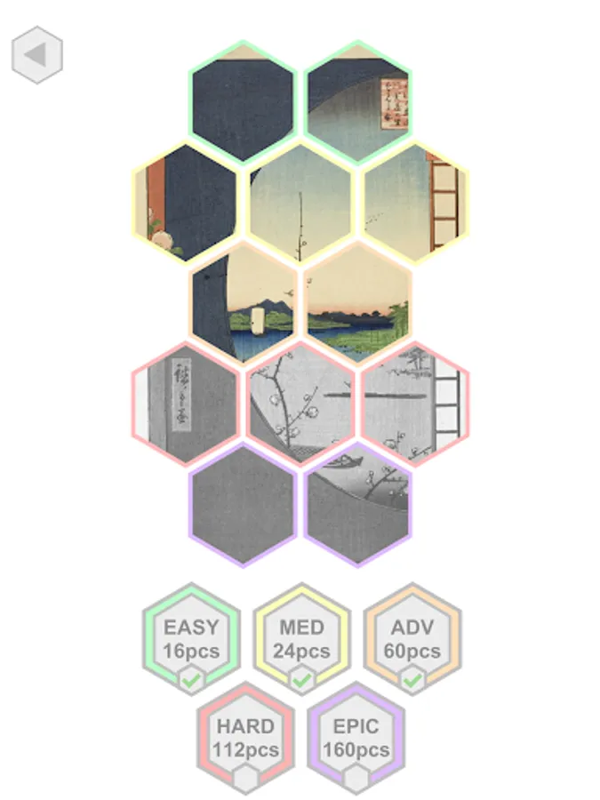 From 4x4 to 10x16 pieces, there are 5 levels of puzzle difficulty.