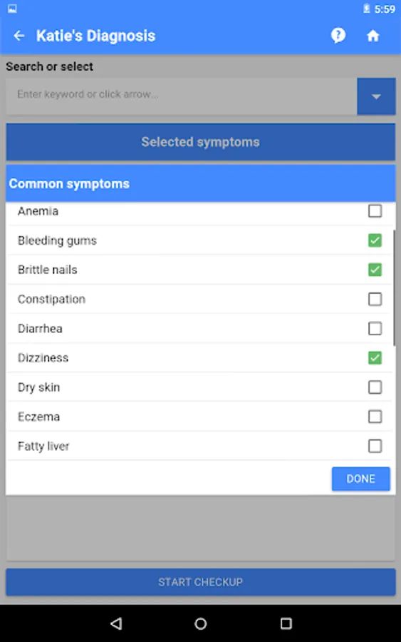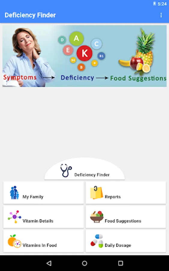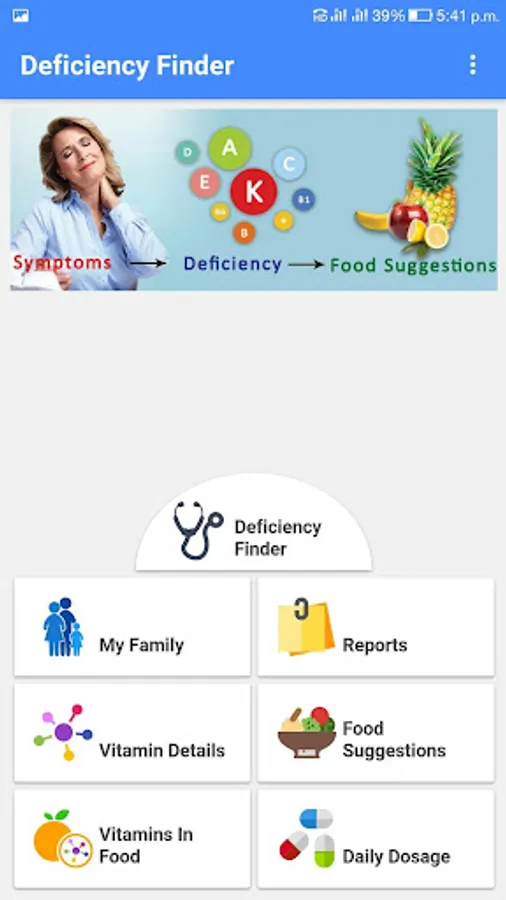 The application can find the vitamin deficiencies by matching your specific symptoms and provide corresponding food suggestions. Also provides nutrition details in common foods, key vitamin information, dosage of supplements etc.. Vitamin Deficiency Finder (VDF) from YantraMind helps you match your specific symptoms against hundreds of symptoms of deficiency of common vitamins and minerals. Based on a highly optimized interactive verification process, about the presence or absence of related symptoms, the app can find possible deficiencies and the relative probability of each of those deficiencies. This report can be can be sent over mail and saved for future reference. App also provides food suggestions and all the other important details like key functions, daily dosage, toxicity symptoms, etc. for these vitamins. The app supports multiple profiles so that more users (like different family members or a group) can keep track of their specific reports, history and trends.