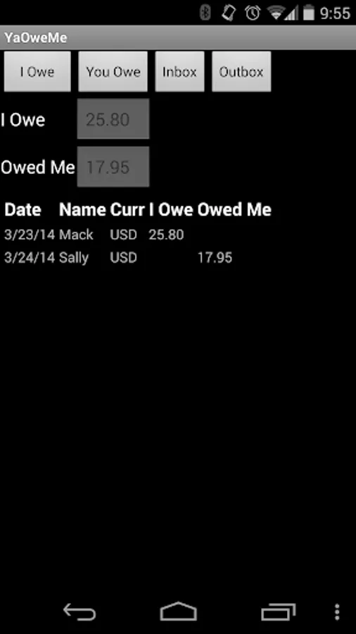 That's what you get with this app. No eye-catching graphics or cute sounds. Just solid functionality that encompasses all phases of a debt between two people. Since agreement is required on both ends, I wrote two different versions of this app to cover most smartphone users.
