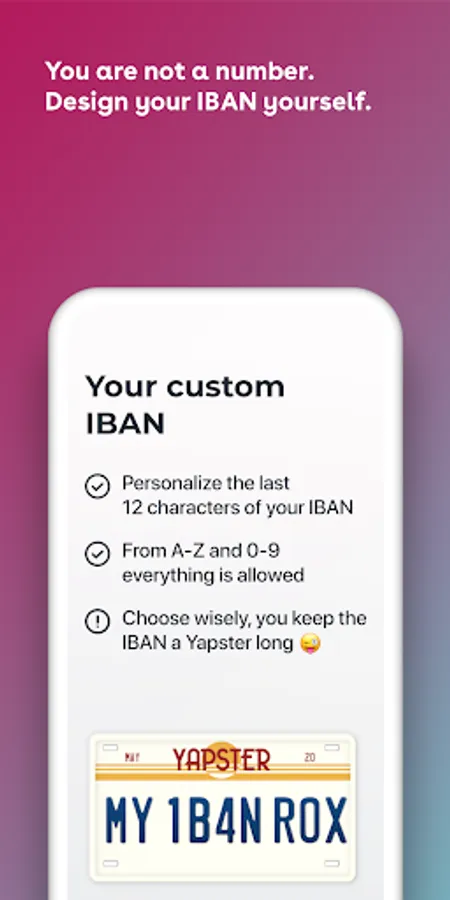 Mobile Payment is a must for you? With us, Apple Pay, Google Pay and Samsung Pay are all on board. Security comes first for you? With us you have one of the best and most secure authentication systems available. Do you like online shopping? Very good, so do we - your Visa Debit can do that too. Hidden fees are a no-go for you? With us you get a transparent view. You want to pay your bills quickly and painlessly? With us you can make payments in no time. And even transfer money to your YAPSTER friends in no time at all. With us, everything is always in real time. Is your account number an anonymous number cruncher? Not with us, turn your account into something personal that you can remember by assigning your own numbers and letters.