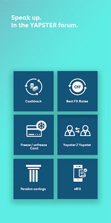 Less banking, more digital: YAPEAL is your Swiss account without hidden fees. Instead of paper, we prefer smart features backed by secure and fast software. Register now in 5 minutes and get access to your app and Visa Debit Card.