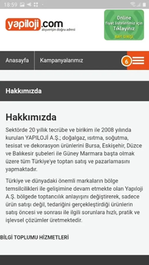 YAPILOJİ A.Ş., established in 2008 with 20 years of experience and knowledge in the sector; natural gas, heating, cooling, plumbing and decoration of Bursa, Eskisehir and Düzce branch mainly serves the entire Southern Marmara wholesale sales and marketing in Turkey.