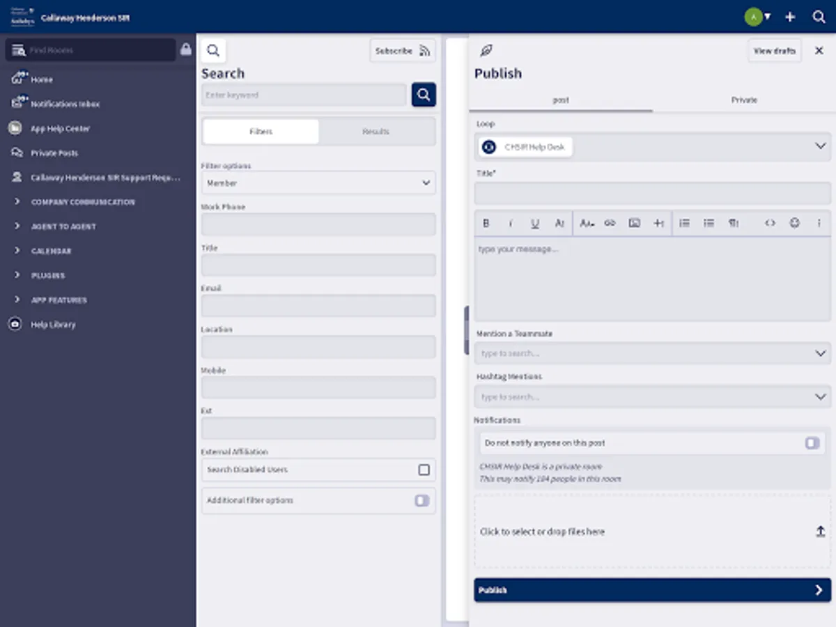 Yapmo for Callaway Henderson replaces mass emails, pulse bulletins and intranets with a more intuitive, all-in-one communications app accessible via desktop and mobile. Users join a loop or room dedicated to a specific project or job function, start conversations, and create or consume valuable working knowledge. By creating more structure around messaging, Yapmo simplifies best practice and information sharing, reduces redundant transactional messaging, and fosters a unique team culture that promotes productivity and teamwork.