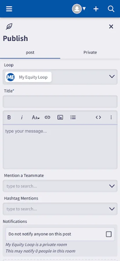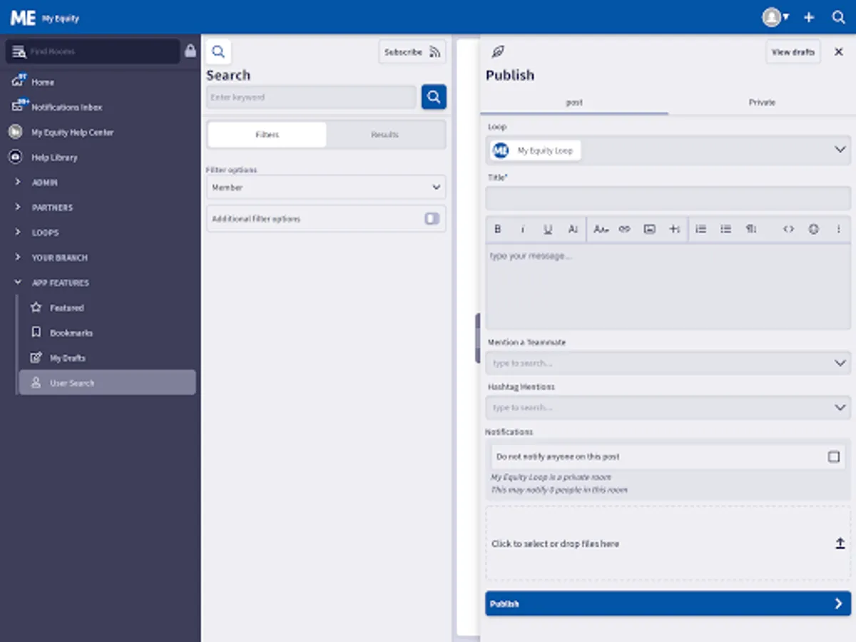 My Equity replaces internal emailing, shared drives, and intranets with a more intuitive, all-in-one communications app accessible via desktop and mobile. Users join a loop or room dedicated to a specific project or job function, start conversations, and create or consume valuable working knowledge. By creating more structure around messaging, My Equity simplifies best practice and information sharing, reduces redundant transactional messaging, and fosters a unique team culture that promotes productivity and teamwork.