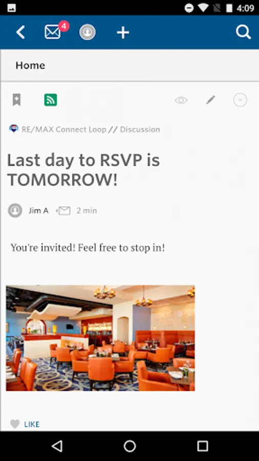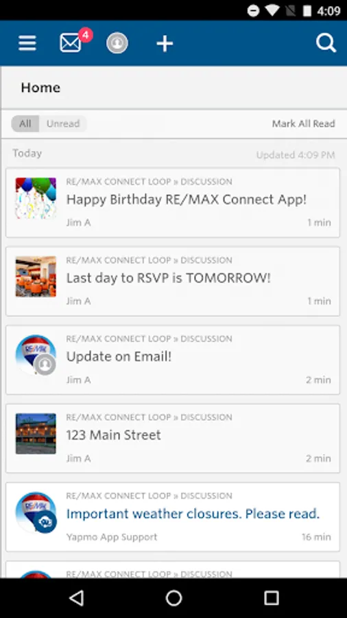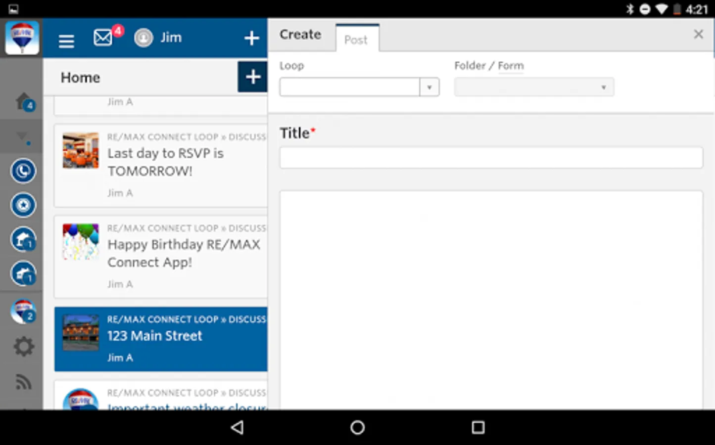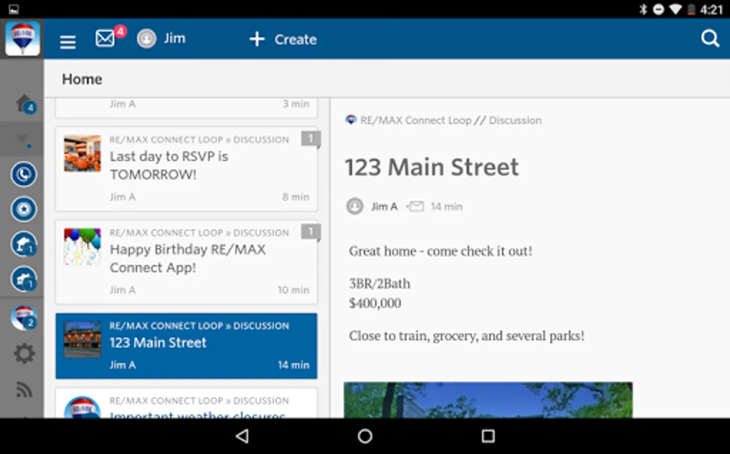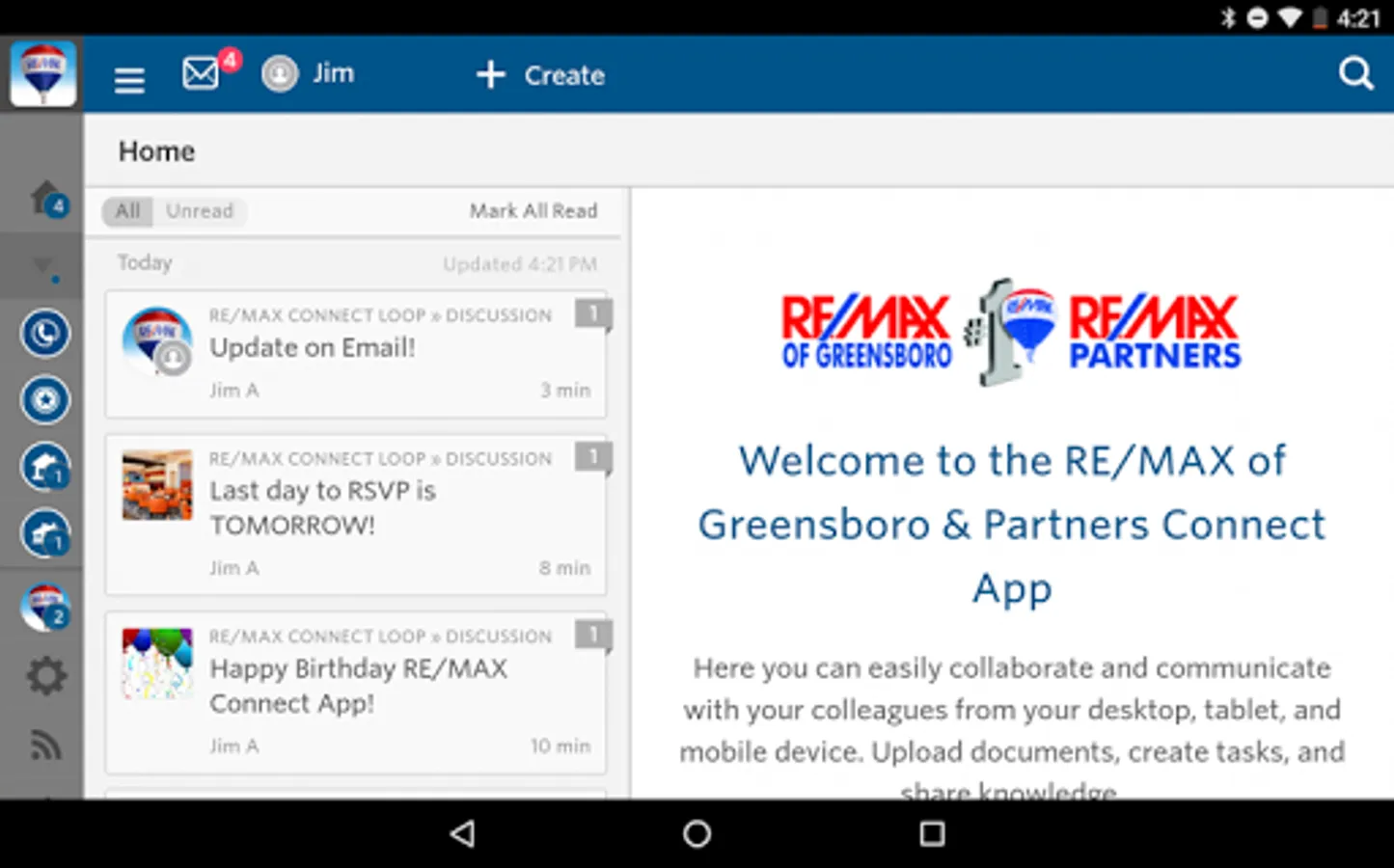 The RE/MAX of Greensboro & Partners Connect App replaces internal emailing, shared drives, and intranets with a more intuitive, all-in-one communications app accessible via desktop and mobile. Users join a loop or room dedicated to a specific project or job function, start conversations, and create or consume valuable working knowledge. By creating more structure around messaging, The RE/MAX of Greensboro & Partners Connect App simplifies best practice and information sharing, reduces redundant transactional messaging, and fosters a unique team culture that promotes productivity and teamwork.