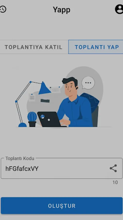Create a meeting and invite others to the meeting by sharing the meeting code directly from the app. You can also rejoin previous meetings by browsing the meeting history.