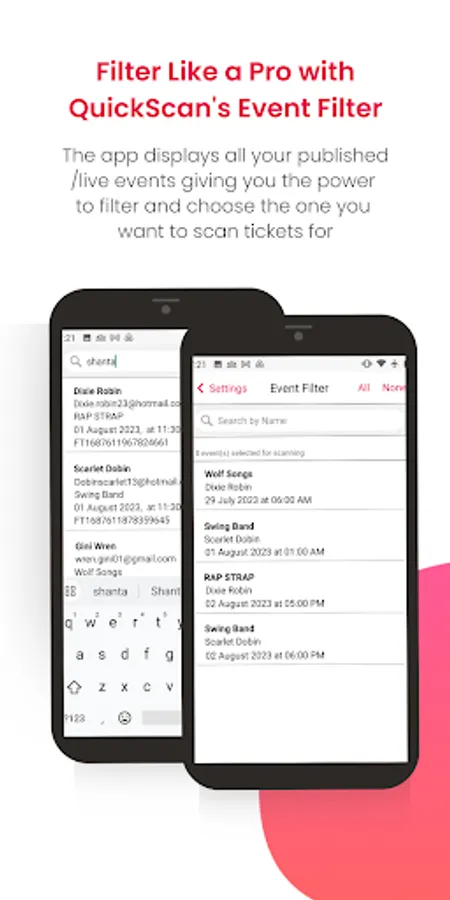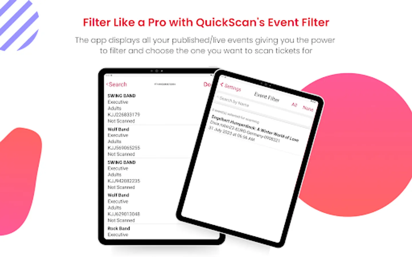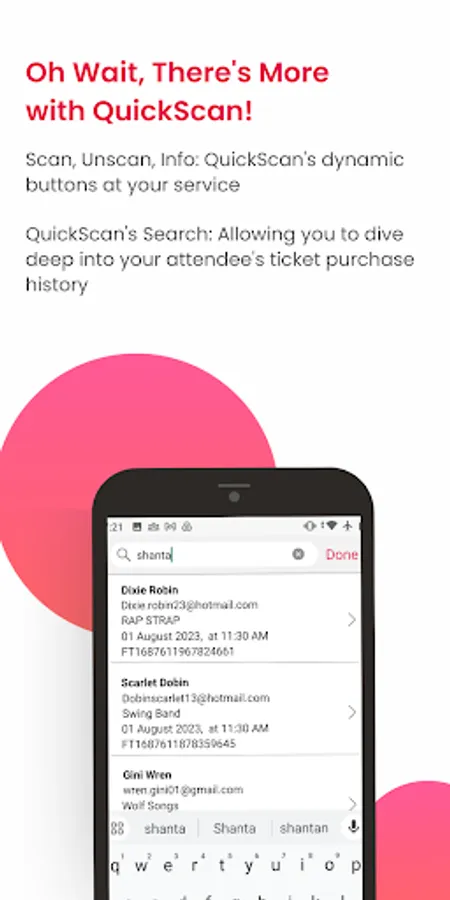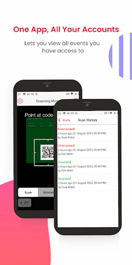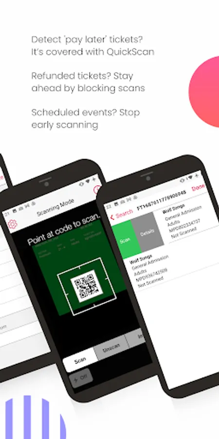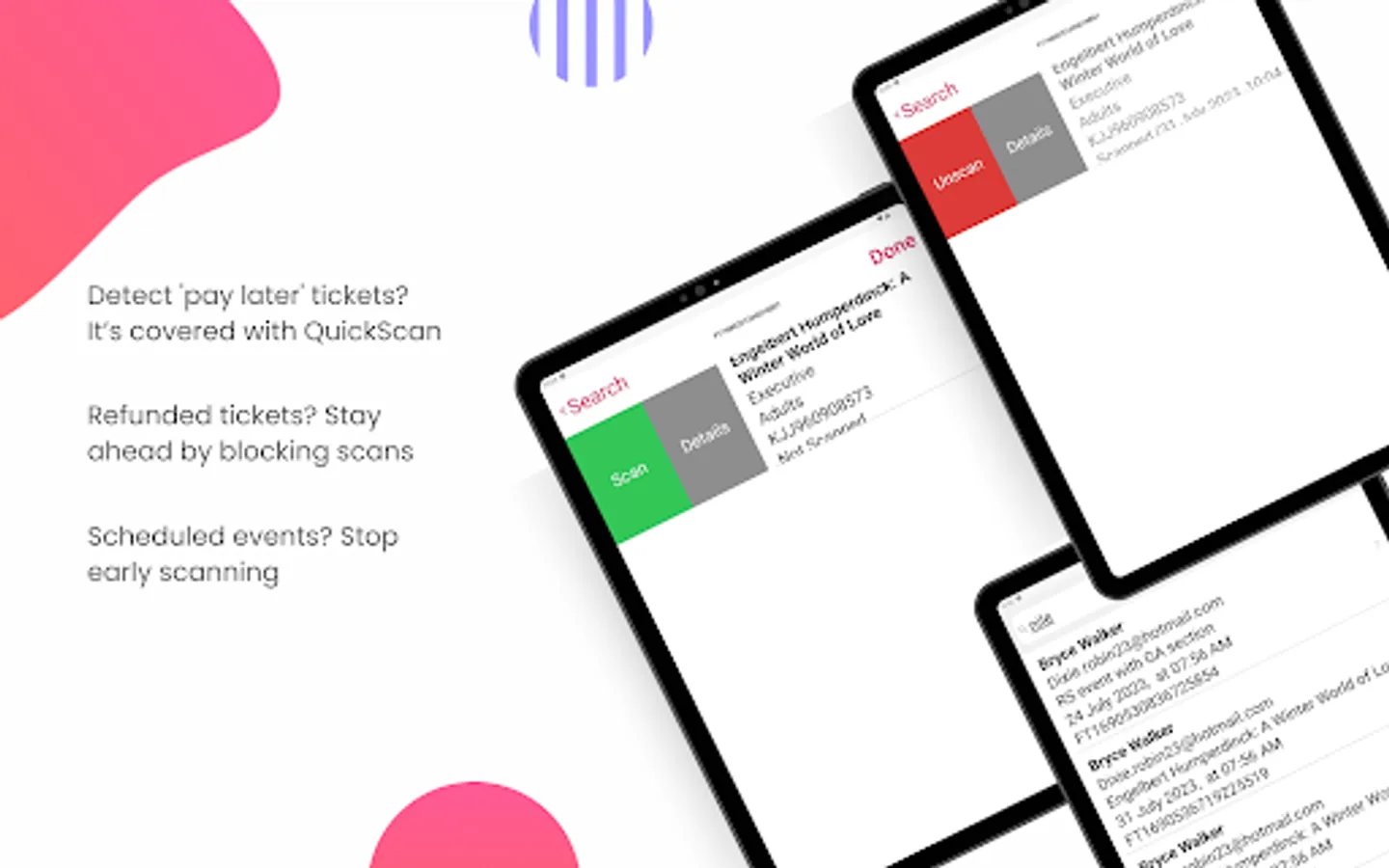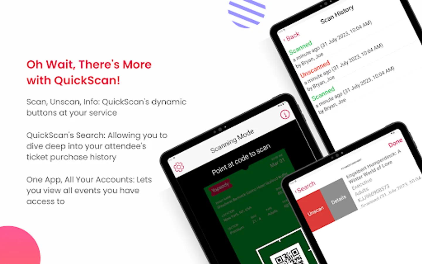 QuickScan’s dynamic buttons allow easy scan, un-scan, and access to attendee info. Dive deep into your attendees' ticket purchase history with the ticket scanning app’s efficient search. Ideal for managing multiple accounts, the mobile app provides access to all your events in one place.