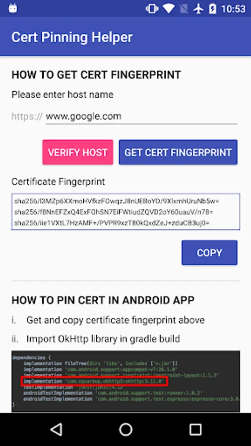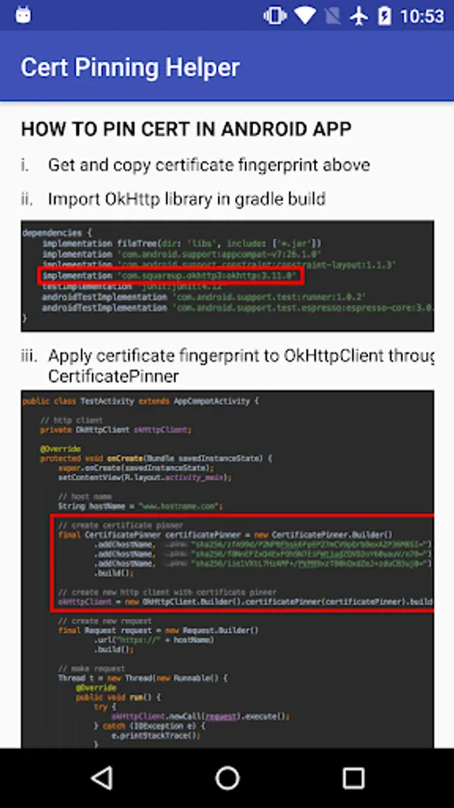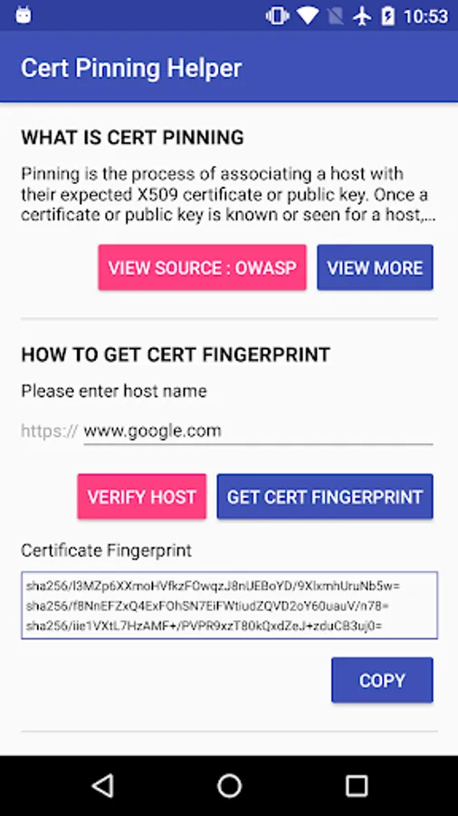 Certificate Pinning Helper is an application that helps to extract certificate fingerprint for certificate pinning use.