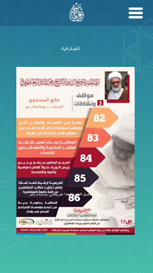 The user is informed through this electronic application on the most important achievements, initiatives and attitudes in the social, economic, educational, ethical, intellectual and human and political development areas in which His Eminence the religious authority Sheikh Muhammad Al Yaqoubi (as long as he is a shadow) addressed multiple segments of society. This diversity reveals the depth of the message of the great Islamic religion and determines its dimensions and its ability to find solutions to various contemporary issues and address the minds on its various paths and trends, as it necessarily reflects the area of interest and good length of reference in the fields of Islamic work