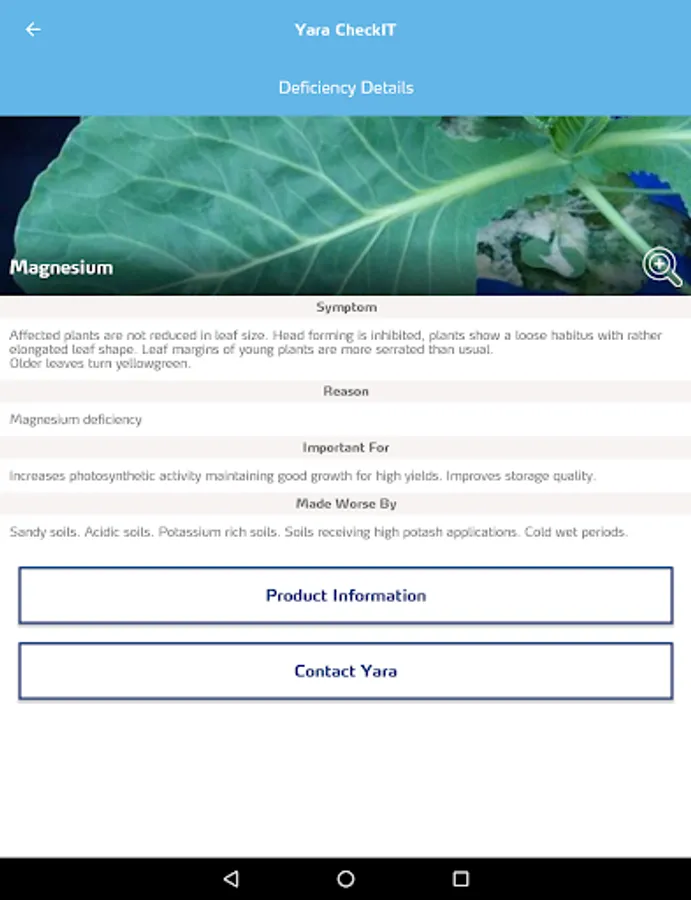 Yara CheckIT is an agricultural smartphone app that gives farmers a photographic library of the crops to allow a simple and fast identification of possible nutrient deficiencies. Once the cause of the deficiency is established, the app gives the further information on how the deficiency affects that crop, what soil types are prone to this type of deficiency and what factors will make a deficiency worse. CheckIT provides a fertilizer recommendation to treat the identified deficiency, as well as alternative products which allow preventive treatment for the following growing season.