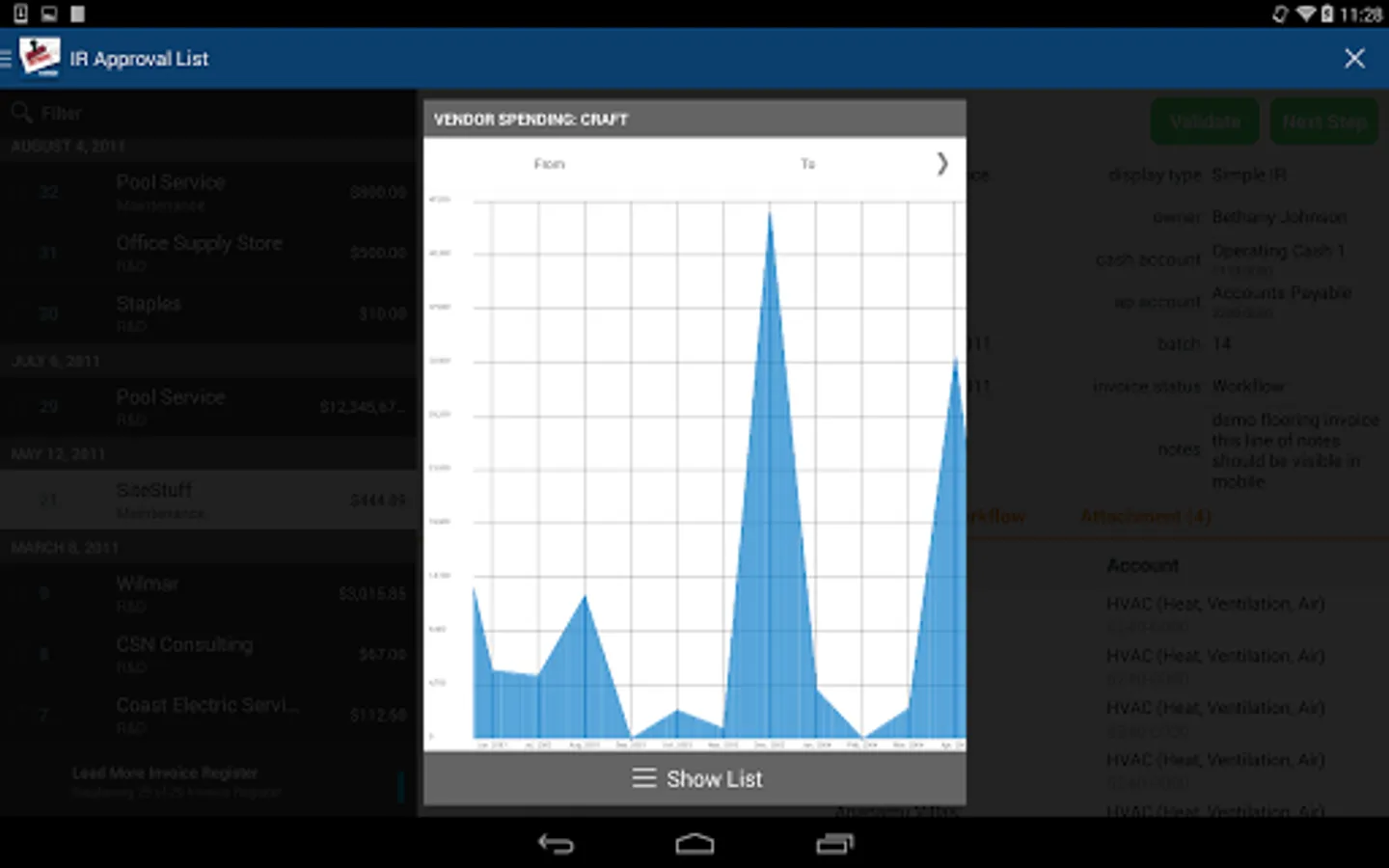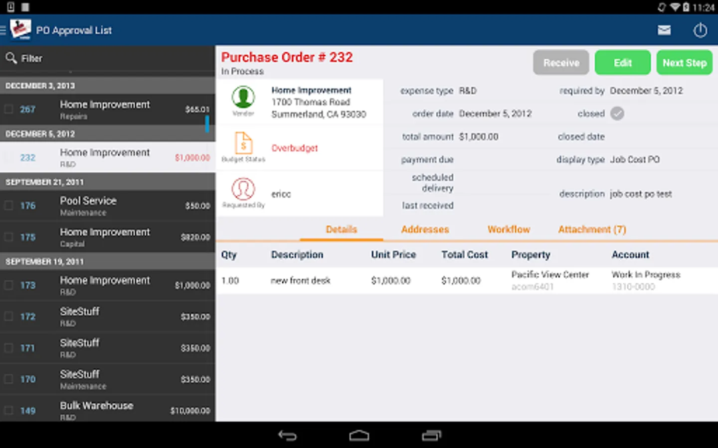 - Drill-down to review purchase order and invoice register details, workflow history, budget information, and attachments