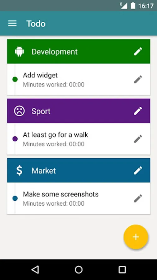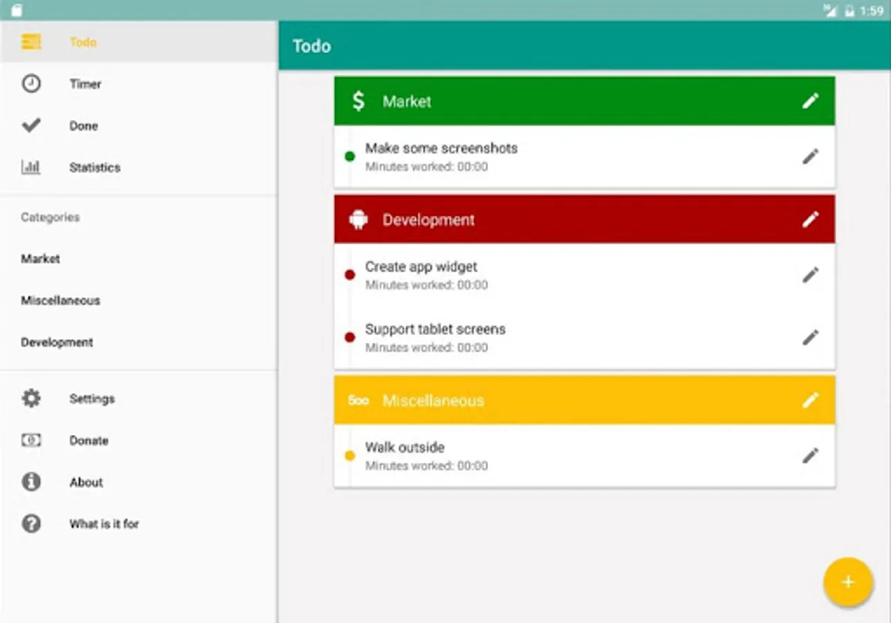 -List of tasks you need to do. You can add, delete, assign colors and default work time to them, reorganize order of tasks (long click to do this), splite them into categories.