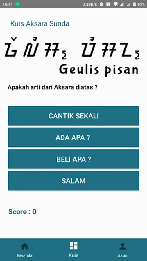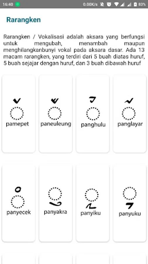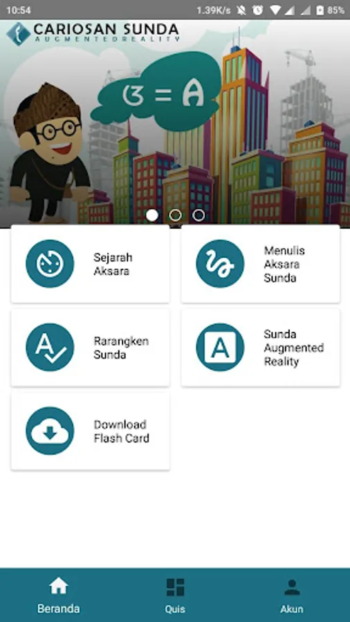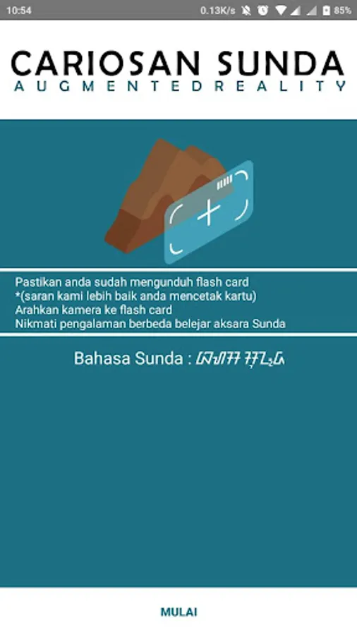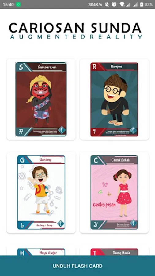 Applications CARIOSAN Sundanese Sundanese alphabet learning application that comes with Augmented Reality (AR). This application has four main features that introduce the kinds of script Sunda, Sundanese language study with AR, Sundanese script writing exercises and quizzes to measure comprehension features users will script Sunda.