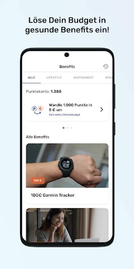 In addition to increased well-being, you can look forward to more health in your everyday life thanks to your budget and the points you have collected. For example, treat yourself to a healthy breakfast or a sports course from the extensive range in the app. Our benefits help you, among other things, to sustainable sports equipment or healthier nutrition. So nothing stands in the way of your health!