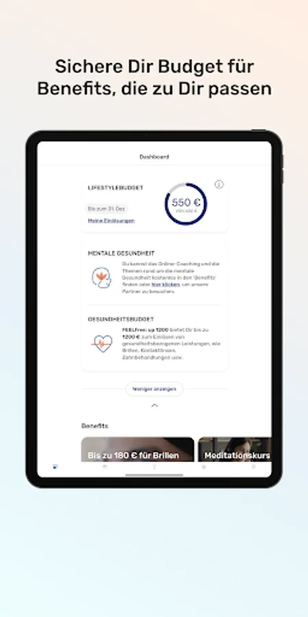 Redeem employee benefits: You can decide for yourself which employee benefits you want to redeem. You can choose from various benefits in the areas of food, mental health, mobility, fitness and much more. Just browse the catalog and choose something. Which benefits you decide on remains your private matter. The company you work for cannot see your data.