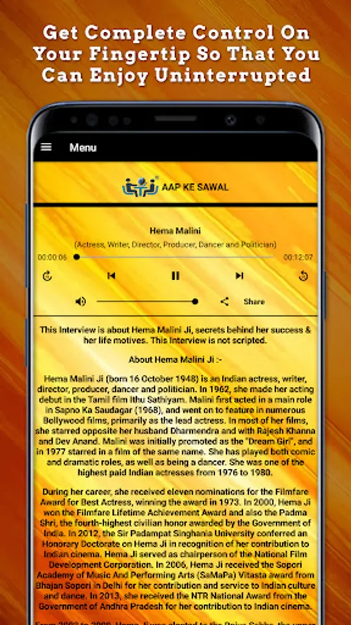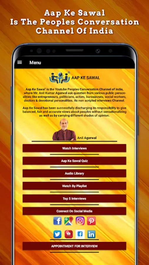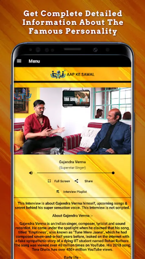 This is the exclusive app launched by "AAP KE SAWAL" for premium customers at zero cost, which gives you personal information about world-famous personalities through their interviews.