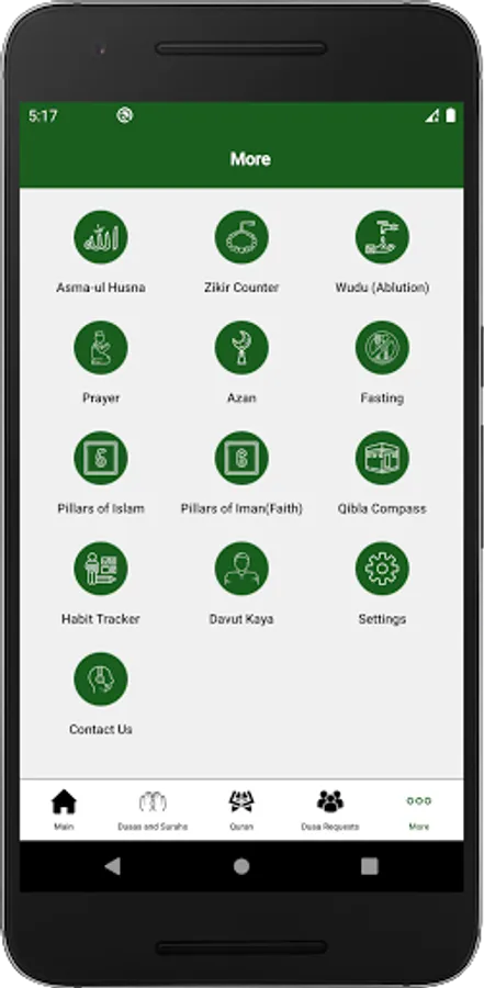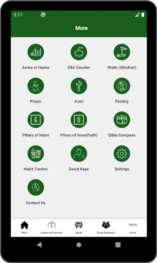 The main categories are Duaas and Surahs, Azan, Wudu (Ablution), (Salah), Names of ALLAH, Pillars of Islam, Pillars of Iman, Thikr Counter, Duaa Community and Qibla Compass.