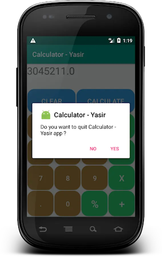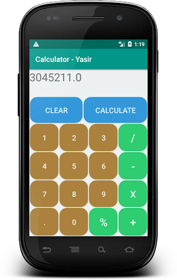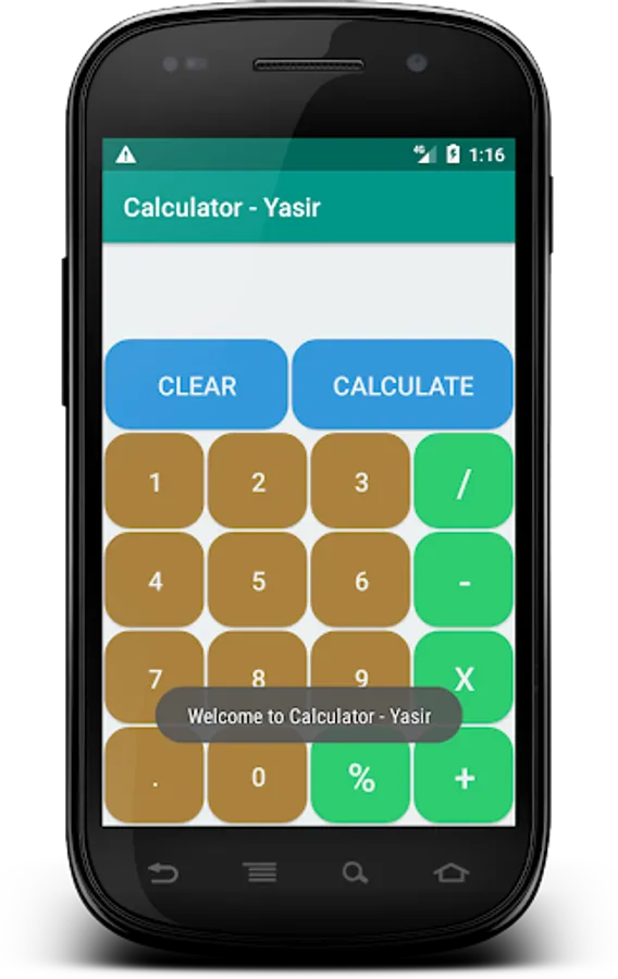 The Calculator - Yasir app has a very simplistic User Interface and colorful different buttons. The calculator will accept two numbers and based on the operators it will give you results.