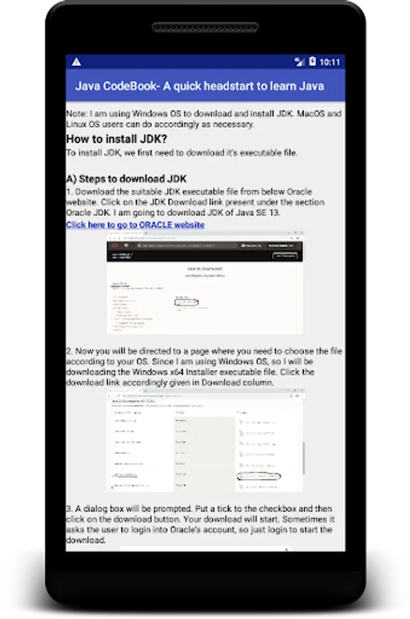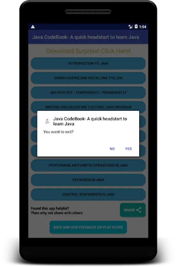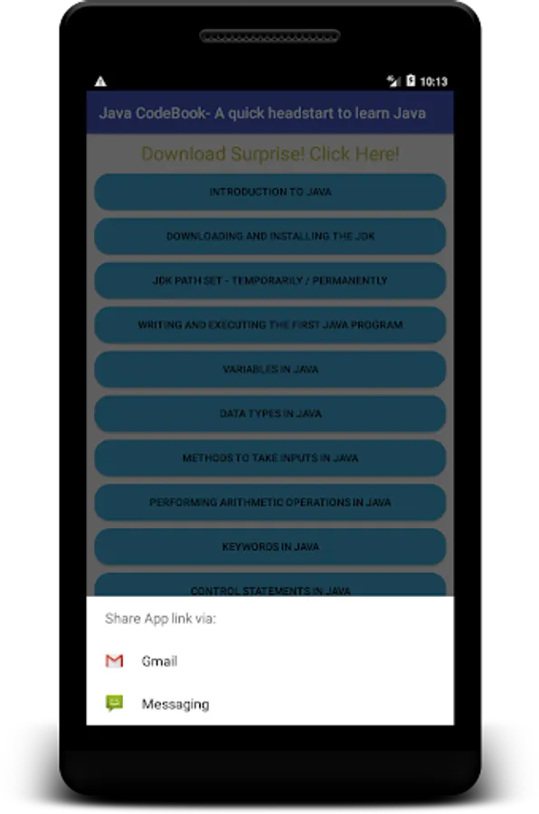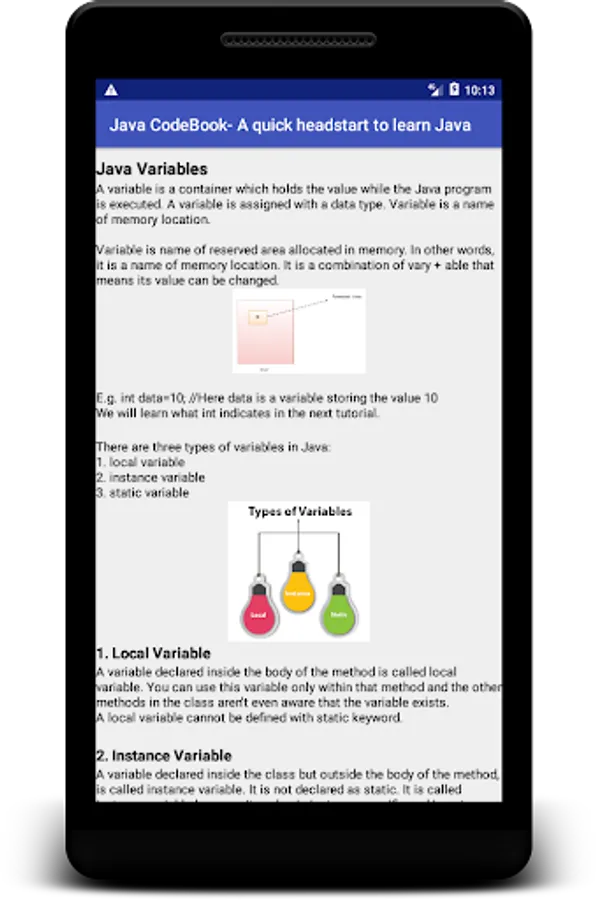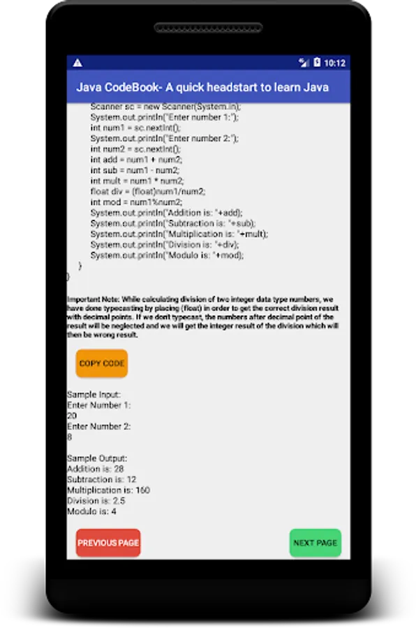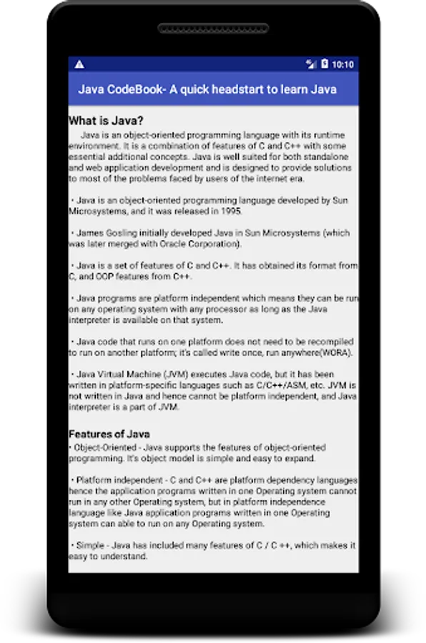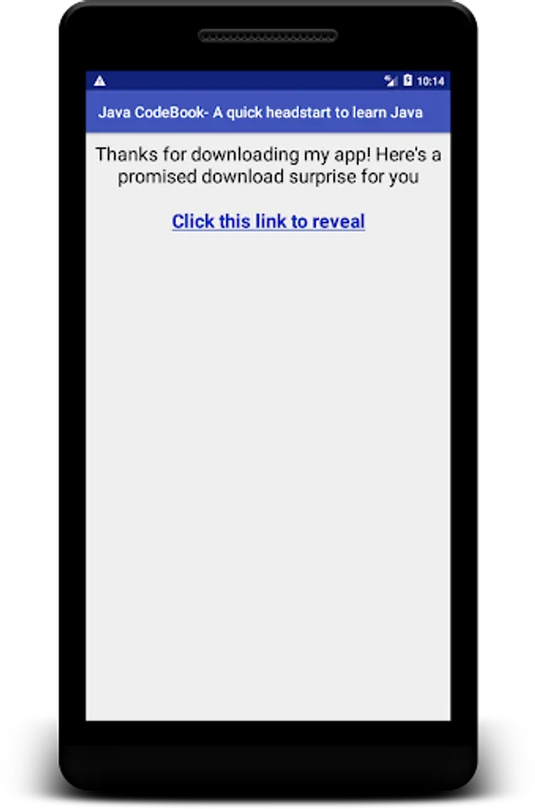 Java CodeBook application will provide a quick and necessary guide to give you headstart and boost in your learning journey of Java programming. Become advanced from beginner in a short span of time. The topics and their related programs are well-structured and explained in details to help you understand them. This application also comes with a download surprise which will help you eventually further in your journey of Java programming. I will be adding more concepts and programs soon because I am working on them, means writing and executing them to provide you a correct, tested and executable code. Thank you. Happy learning!