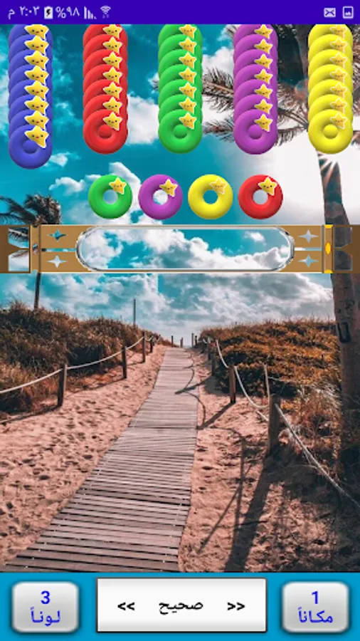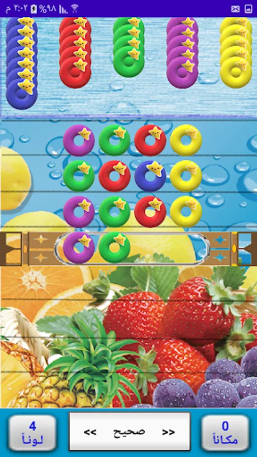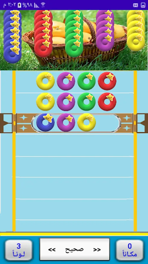 - The game is easy and clear at the level of the interface, as a group of donuts in five different colors appear at the top of the next page and there is a rectangular frame in the form of a crane that can accommodate only four donuts, put four of them in different colors without repeating.