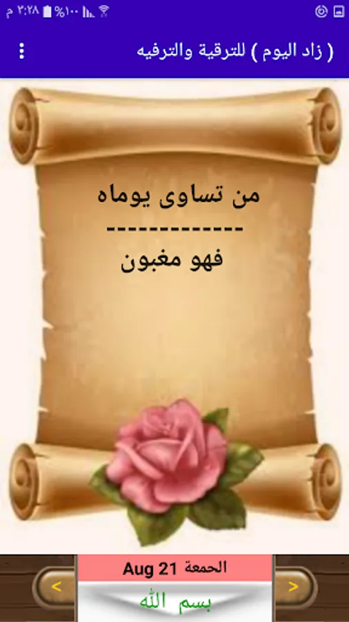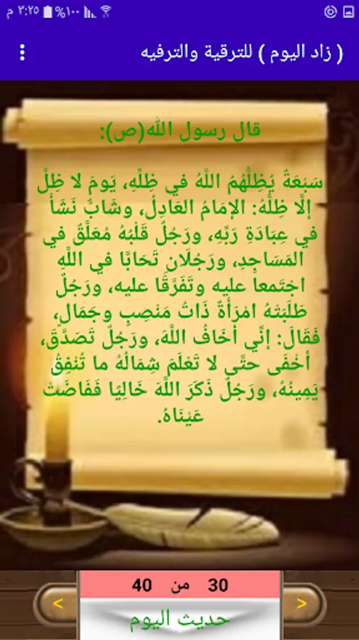 The application contains many sections: (Today’s Qur’an, Hadith of the Day, Supplication of the Day, Remembrance of Today, Wisdom of the Day, Jurisprudence of the Day, Knowledge of the Day, Poetry of the Day, Personality of the Day, Today's Idea, Today's Mystery, and last but not least the feature of the day).