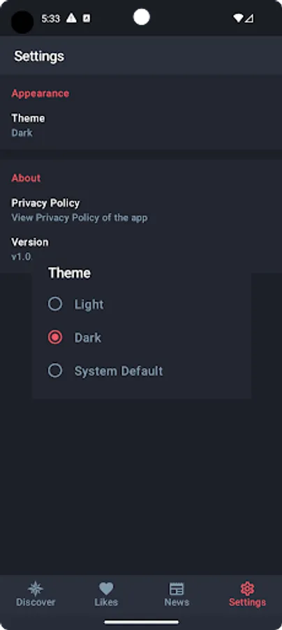 When you switch to the dark theme on the iPhone the app will automatically go dark.