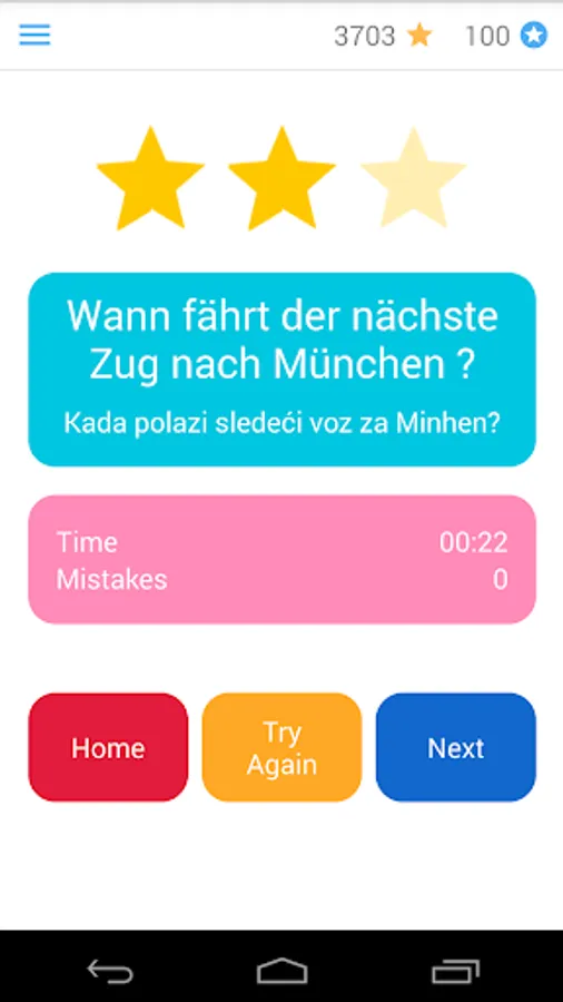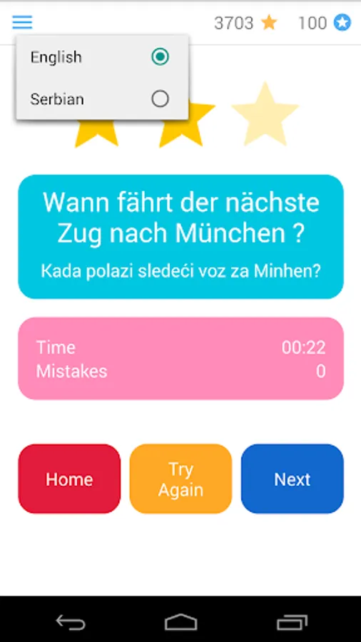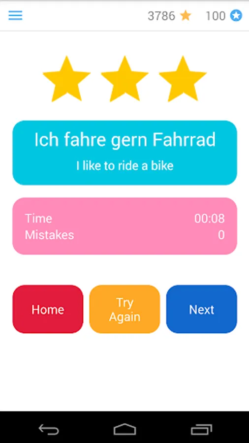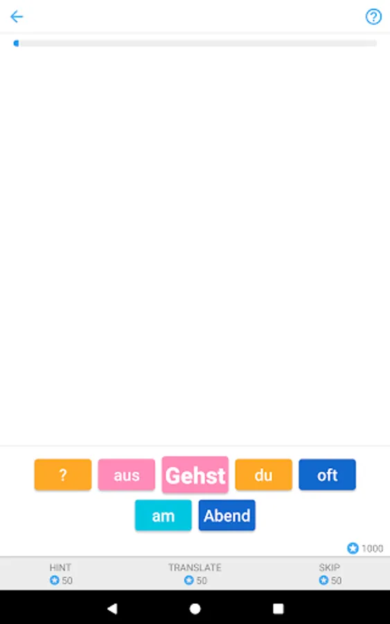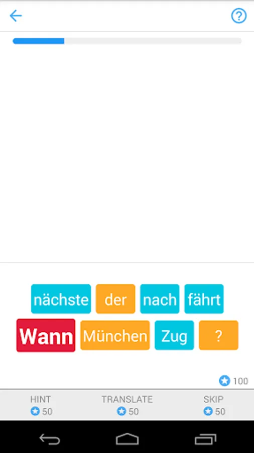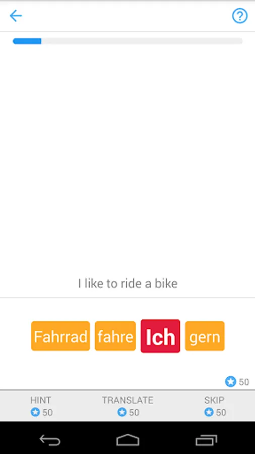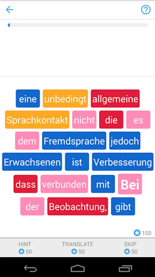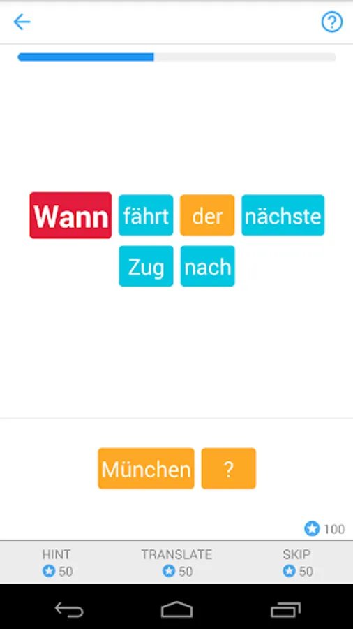For every correct German sentence, you get points which you can use for hints (when you don’t know the next word), translation or to skip a sentence.