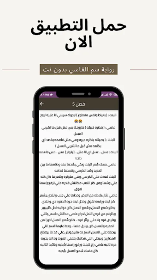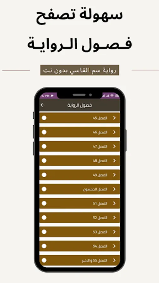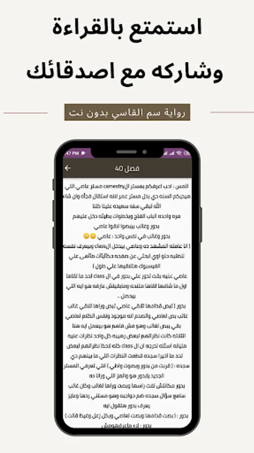 The application of the novel "Sim Al-Qasi" is distinguished by dividing the chapters in an easy-to-use and convenient way, and it also features the sharing feature.