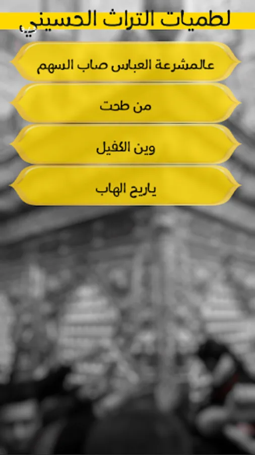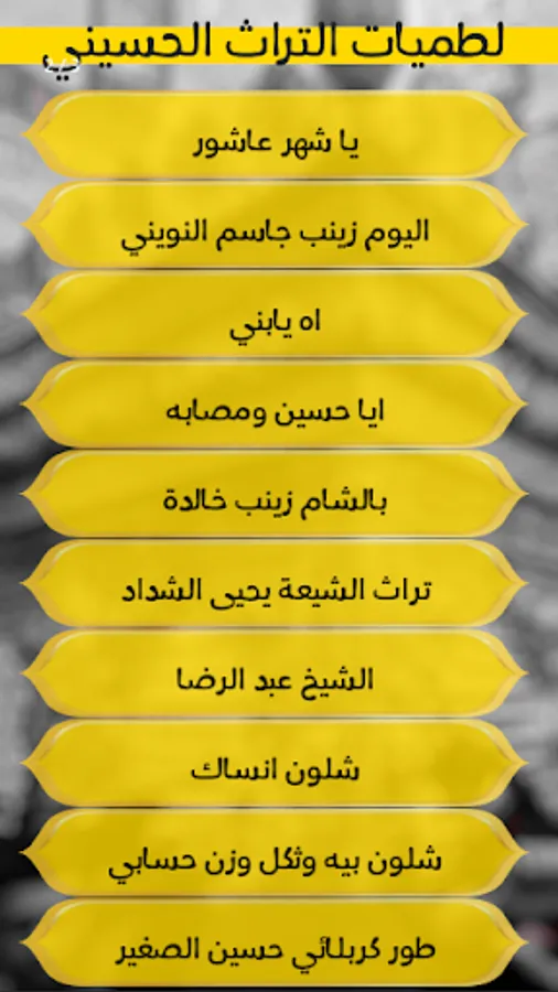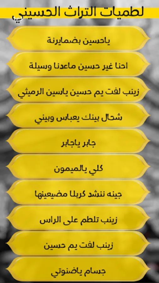 The application contains the most famous and most beautiful ancient Husayni latamiyat for the pioneers of Husayni reciters, such as Hamza Al-Saghir, Yassin Al-Rumaithi, Jassim Al-Nuwaini and other honorable readers