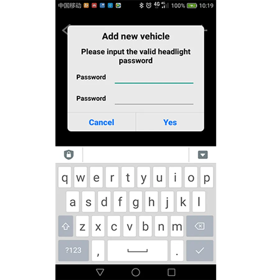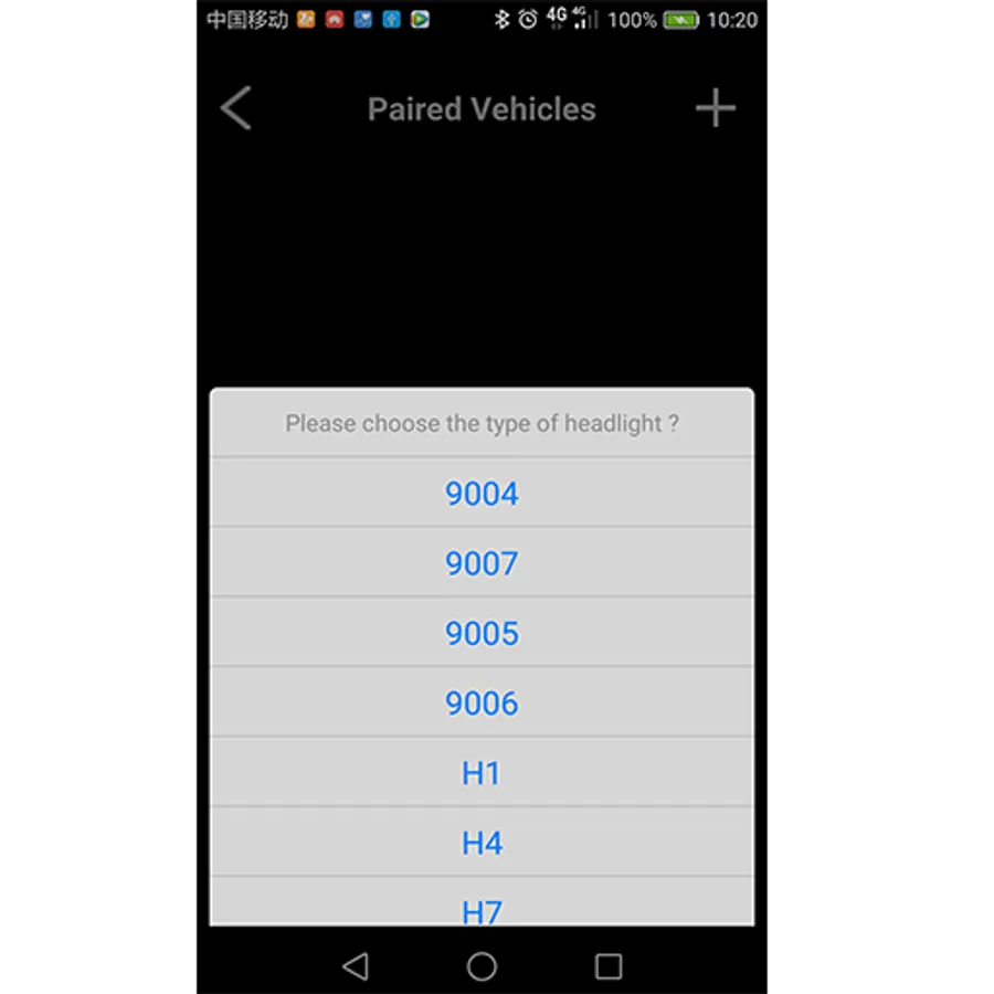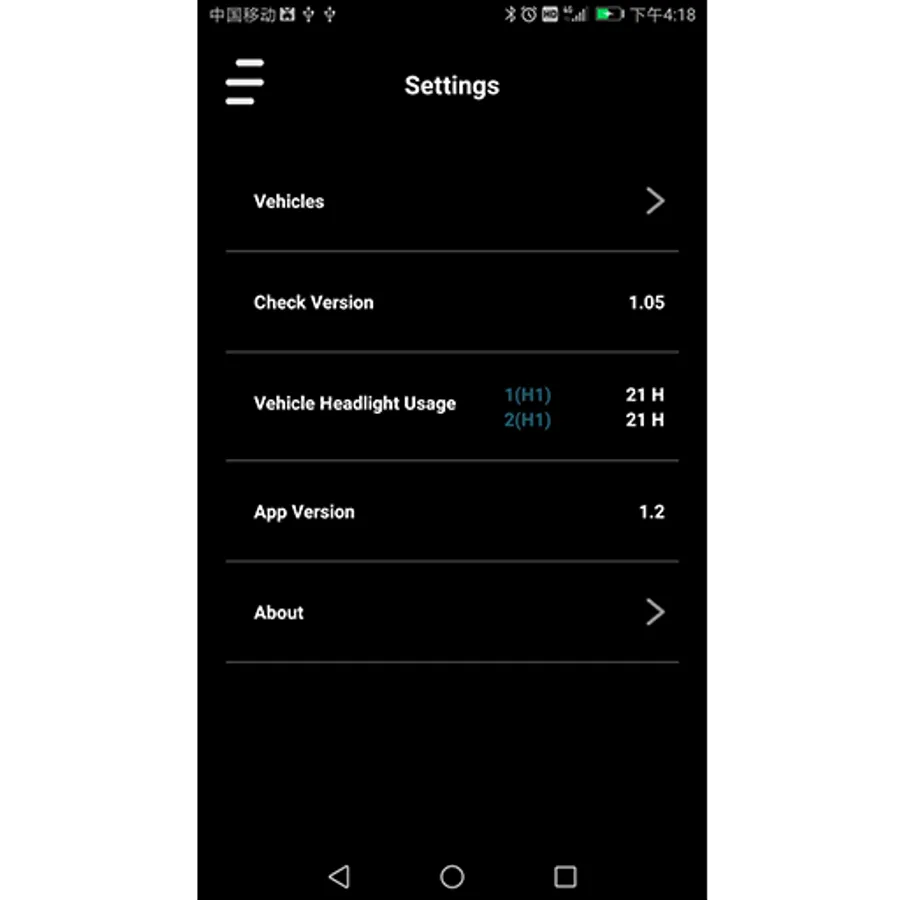 3). Press top left button “ ”, choose ‘Settings -> Vehicles. Press top right button “+”. Under “Add new vehicle”, enter your preferred name for your vehicle, ex: Plate Number, Car Type, etc. Press “OK” and the device will notify it is “Scanning for available headlights…”. Enter both SF300 devices’ codes provided when prompted and press “OK”. Then, choose the headlight model when prompted during “Select the Lamp Type”, the device will start pairing. If successful, notification will pop up, displaying headlights as “1” and “2”, headlight models, and each headlight’s Bluetooth address. If pairing failed, popup will notify pairing failed.