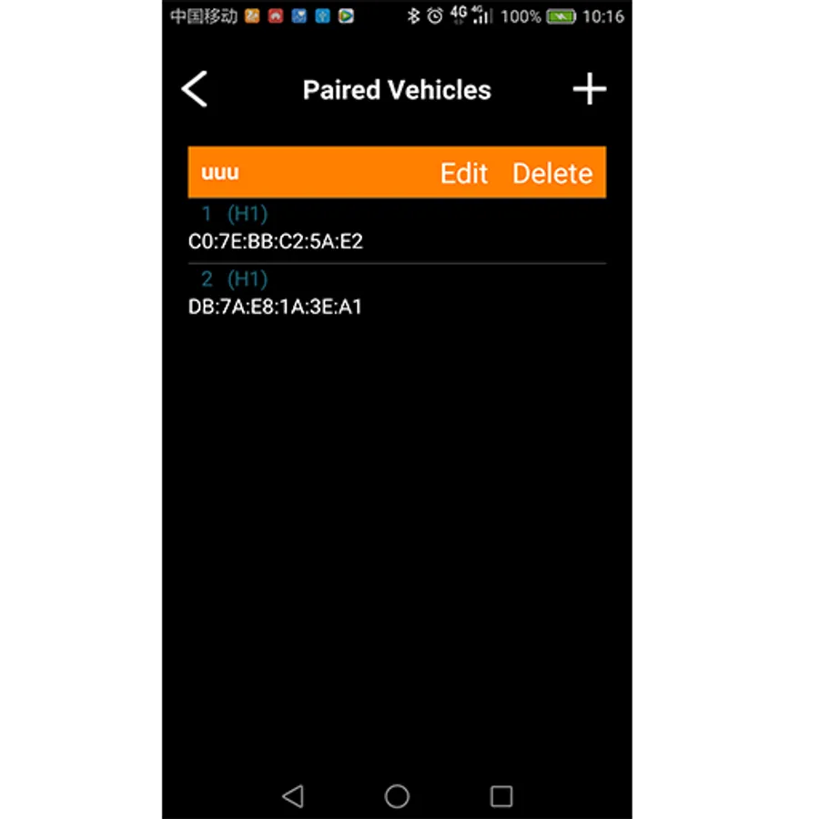 Vehicles: Main function is to pair SF300. After pairing, the SF300 Bluetooth Addresses of paired vehicles are located here. To switch between controlling multiple vehicles, press the desired vehicle to switch to it. The current vehicle the App is controlling will be indicated with orange lettering to the vehicle name and green lettering to the two SF300 headlight devices. All other devices will have gray lettering to indicate it is currently not selected. To delete or edit each vehicle, press the Delete or Edit button next to the vehicle name. Pressing it will enable user to edit or delete vehicle’s SF300 BLE connection, vehicle name, and/or headlight model types.