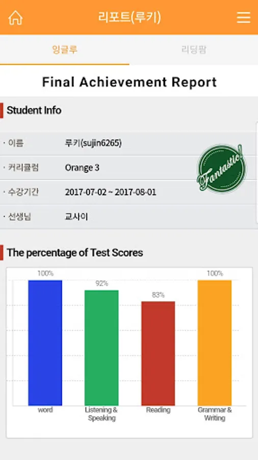Provides report results taken on campus (Final, weekly test, JET, TOEIC Bridge, Reading Farm, 3 types)