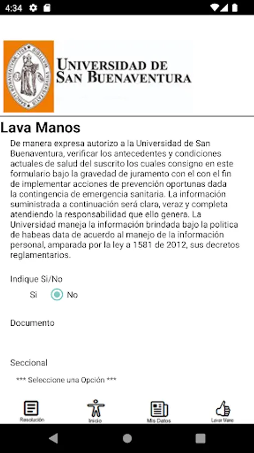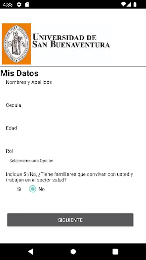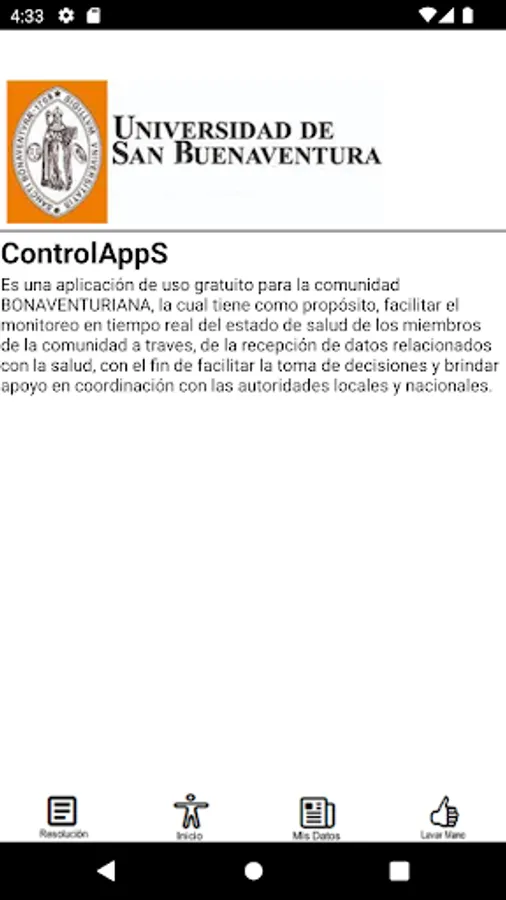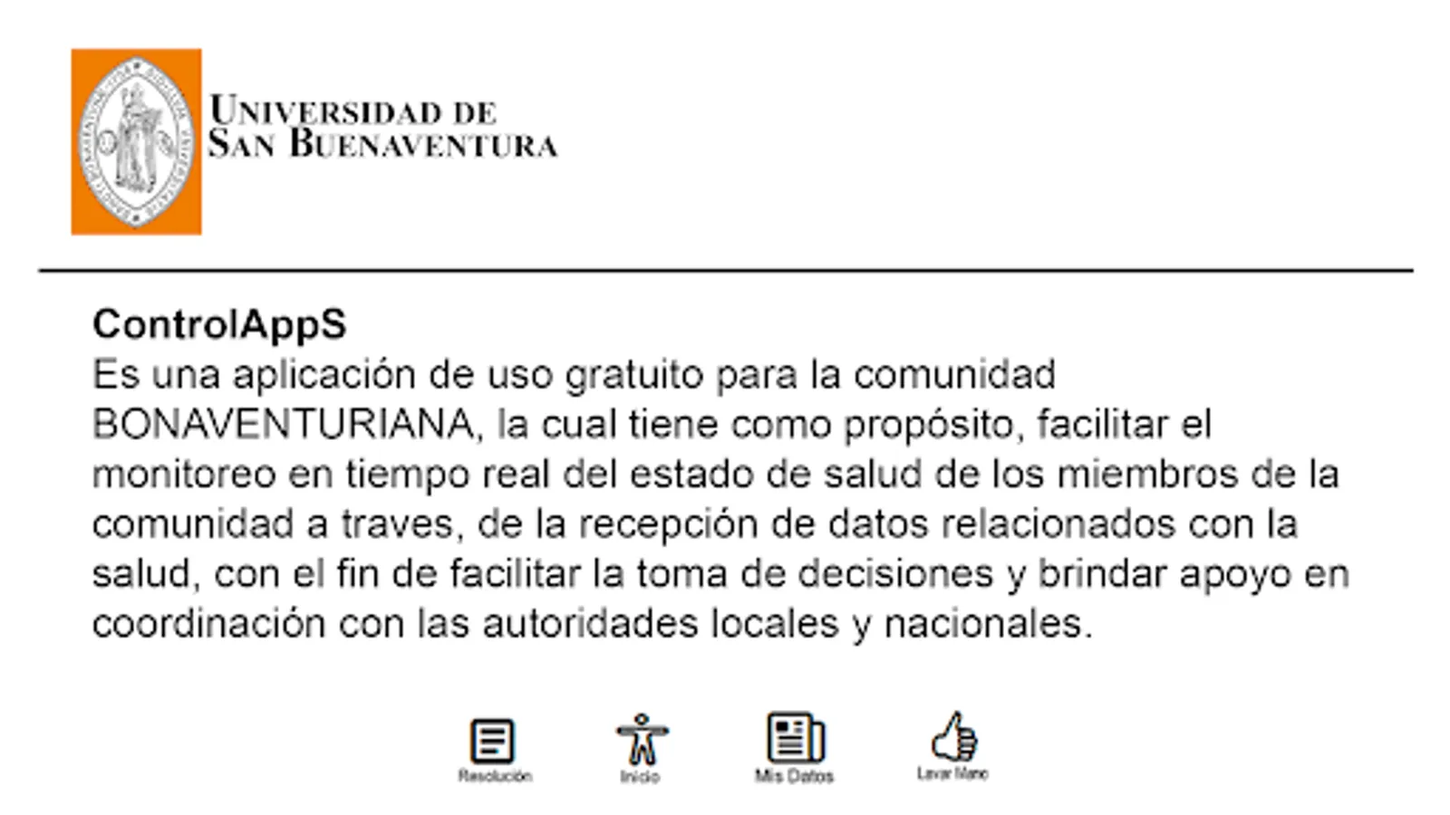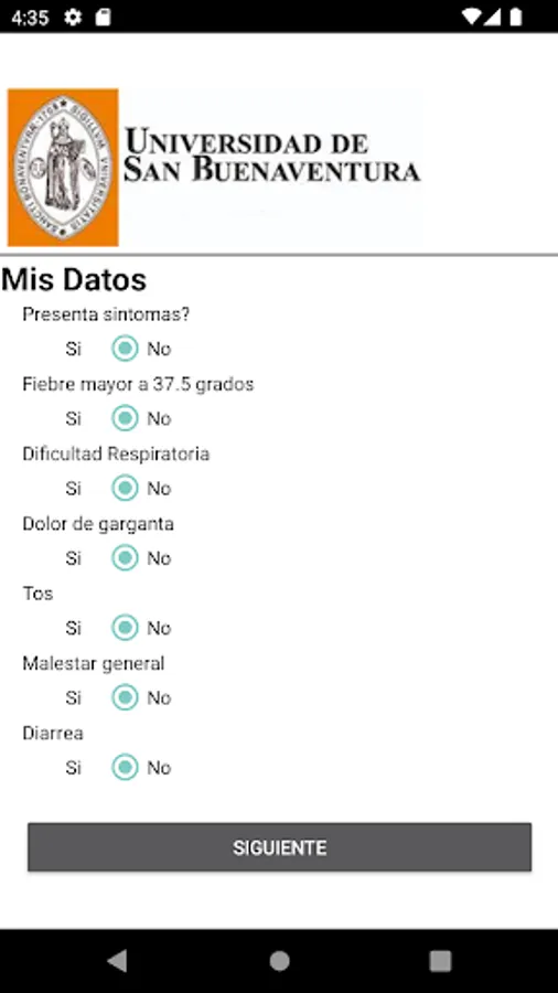It is a free application for the community of the University of San Buenaventura, whose purpose is to facilitate the recording of personal data in real time regarding symptoms related to