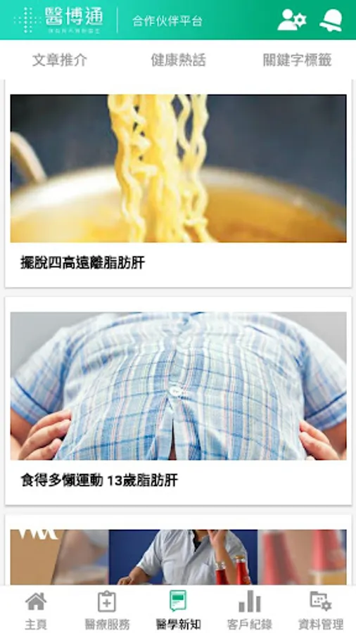 醫博通合作夥伴使用端(APP)只適用於特定之合作機構。使用者能夠為其會員及客戶進行不同種類的醫療及檢測服務預約及進度跟進,以提升整體客戶在醫療服務之體驗。