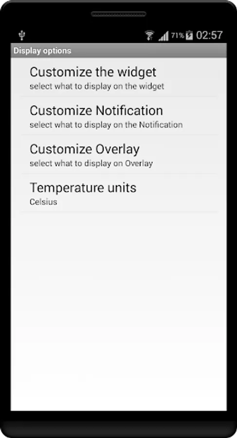 ■ upgrading to the pro version will enable some more features. Using the pro version you will be able to choose the color and the size of the displayed text, enable the notification bar or enable an overlay display of the info shown on the widget