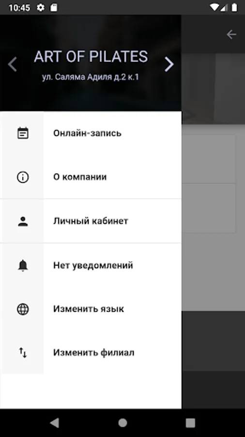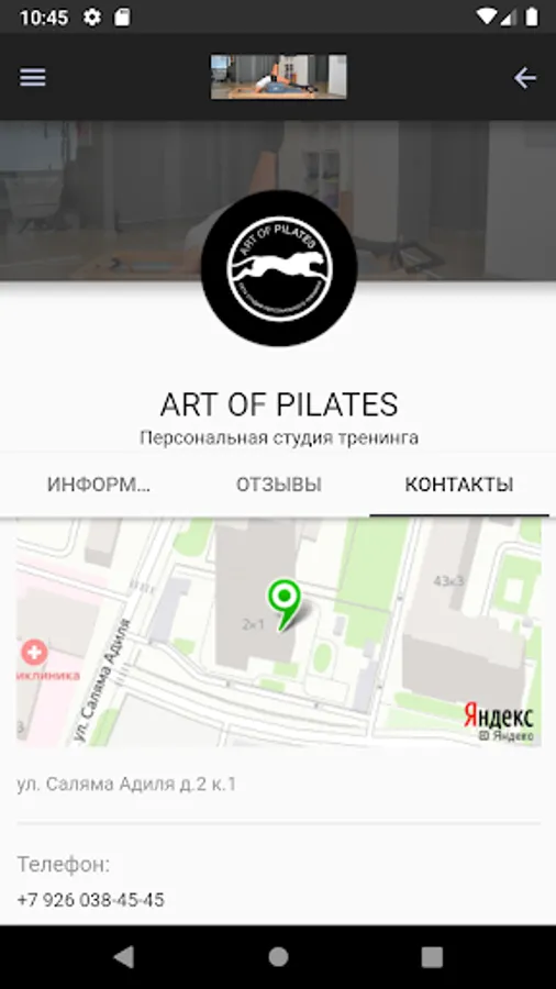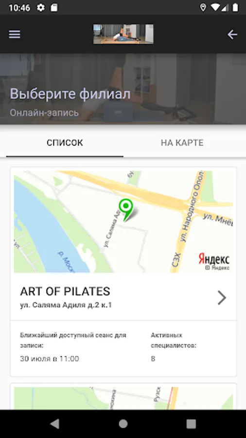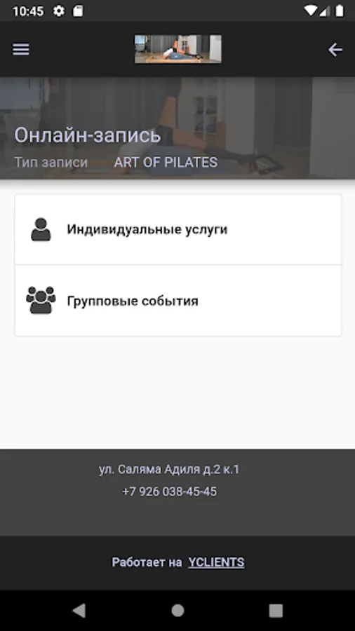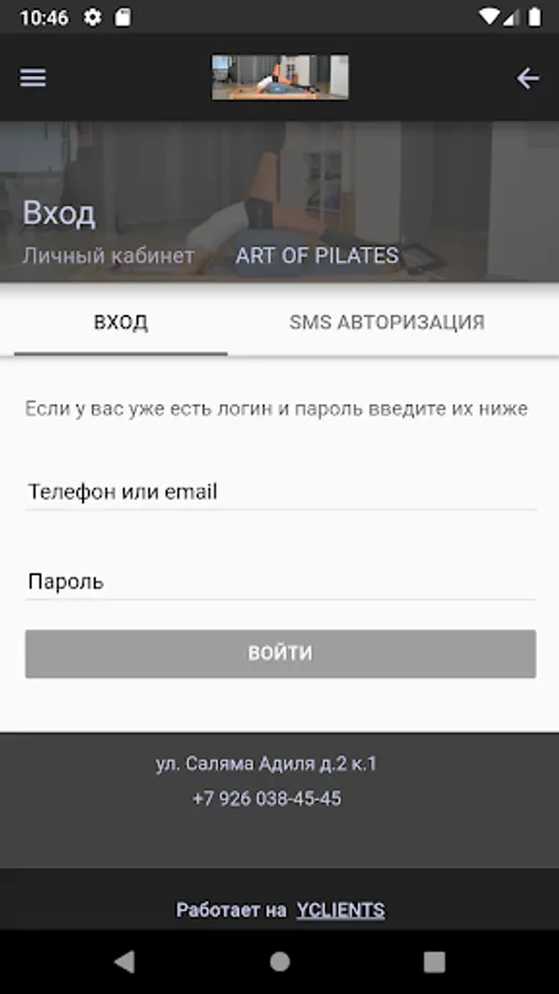 Mobile application for online registration for workouts, massage and body care services.