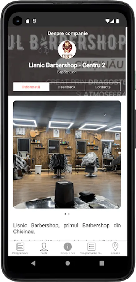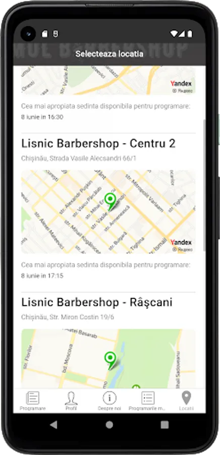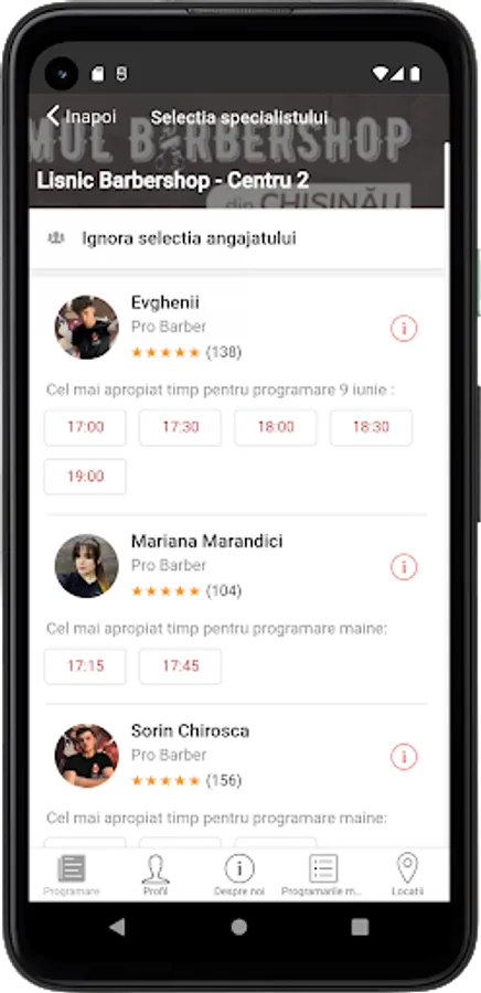 Aplicația "Lisnic Barbershop" of mod. Alege filiala cea mai apropiată de tine, serviciul, meșterul, data și ora convenabilă.