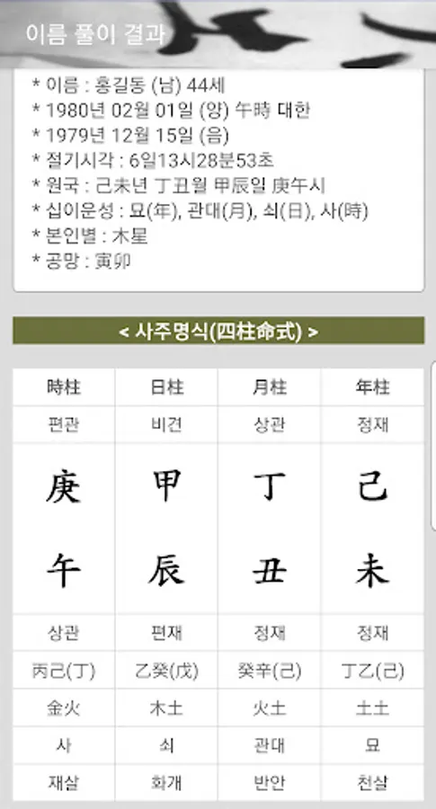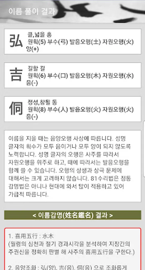 All of the Chinese characters for human names are included, and it is verified that it is built according to the name by finding the five elements of the Chinese character that complement the four weeks. The energy of Yin-Yang and the five elements needed for supplementation after four weeks should not be judged simply by counting the number of five elements.