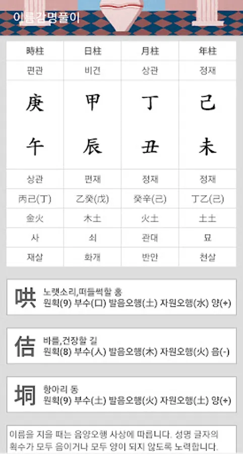 For a good name, based on the date and time of birth, you must accurately analyze the four main characters, such as Dragon God, Hui God, and Gyeokguk, and supplement the missing parts of the four main characters with the name. In addition, it is good to have good harmony and balance with the four keys, and supplementing the five elements necessary for the four keys to help the future luck is a basic requirement for a good name.