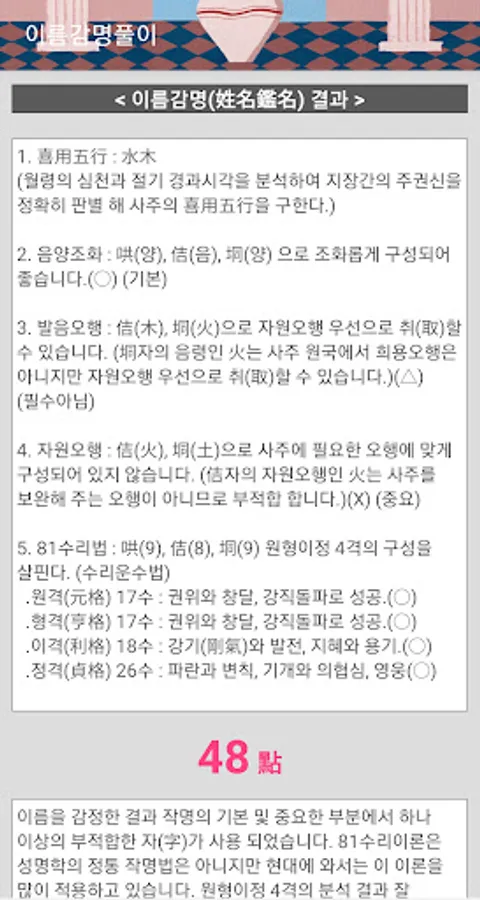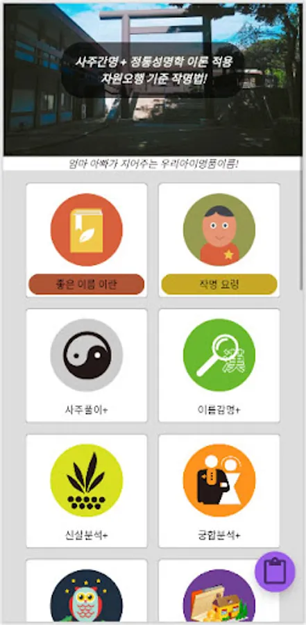 It is made to easily name a good name suitable for a child through systematic analysis and review based on orthodox naming theories with traditional naming theory + resource five elements naming method through four weeks analysis. The key is to accurately analyze the sovereignty of the age of the moon and Jiji in the four pillars to extract the five elements of the resource.