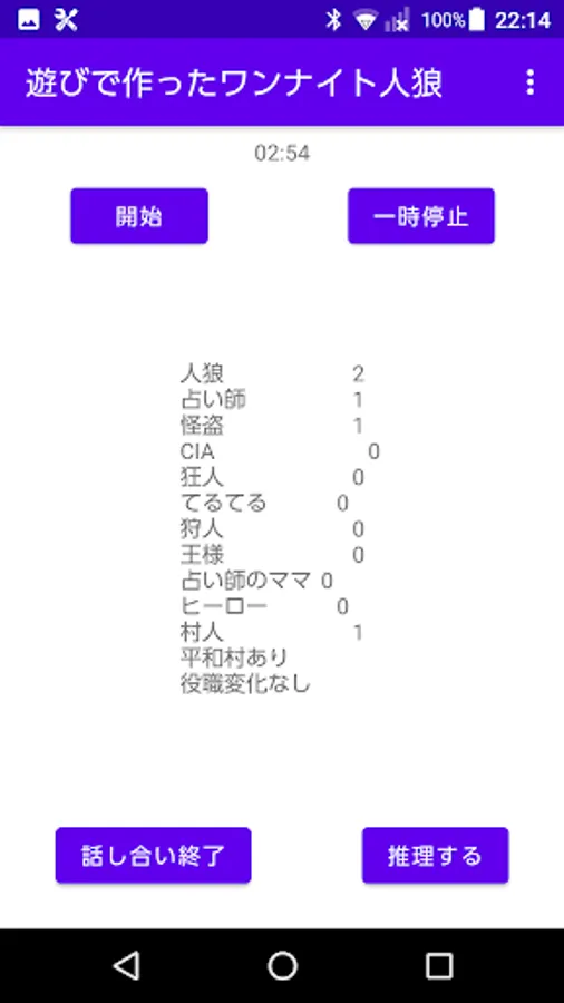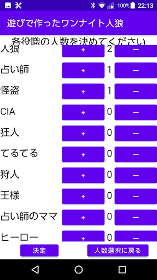 The positions are Werewolf, Fortune Teller, Phantom Thief, CIA, Madman, Teru Teru, Hunter, King, Fortune Teller's Mom, Hero, and Villager.