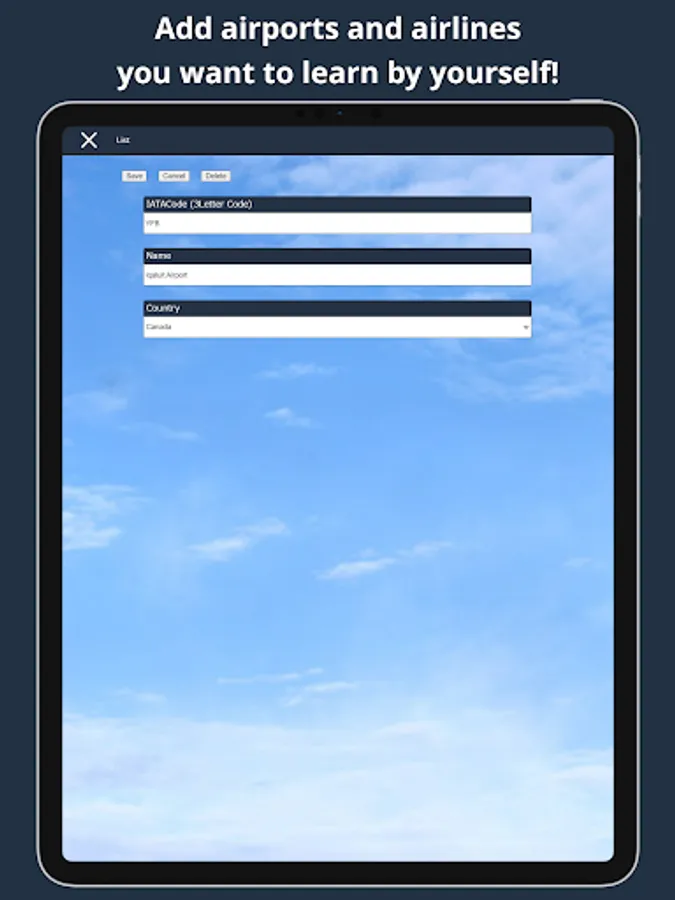 This app is recommended for anyone involved with airlines, travel agencies, trading companies, logistics companies, air traffic control, air force, etc. who need to memorize airport codes and airline codes.