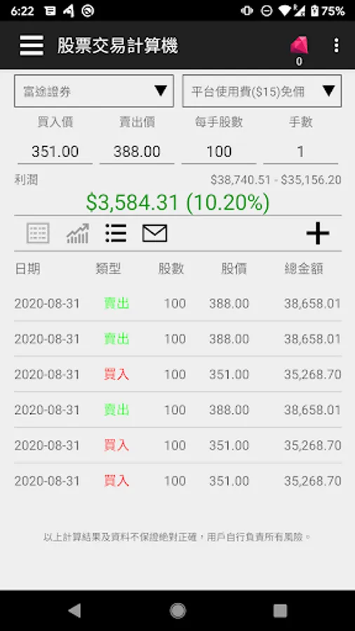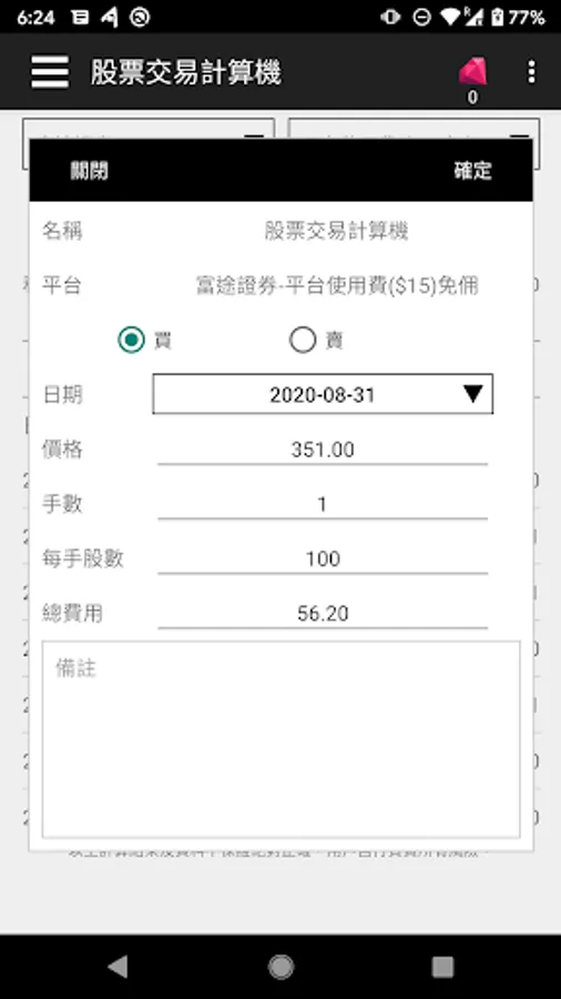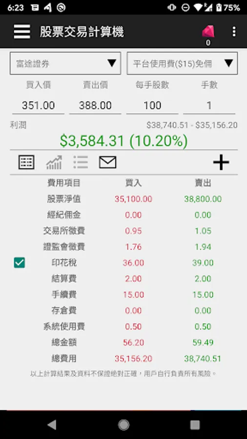 We provide stock trading transaction fee calculation services, including brokerage commission, exchange levy, SFC levy, stamp duty, settlement fee, handling fee and storage fee. The user can get the profit amount through this program.