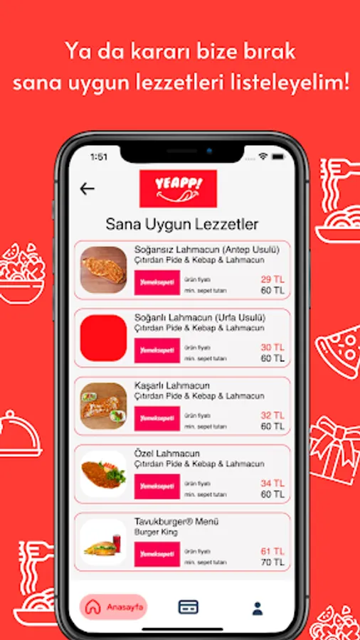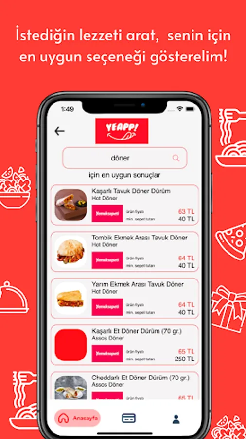 Ne yiyeceğini bilmiyor musun? Yeapp!’in Ne Yesem özelliği ile filtrelemeni yapar, sana en uygun yemekler arasından seçim yaparsın. Üstelik bu seçiminin en uygun fiyatlı olan olduğunu bilmenin keyfini yaşarsın.