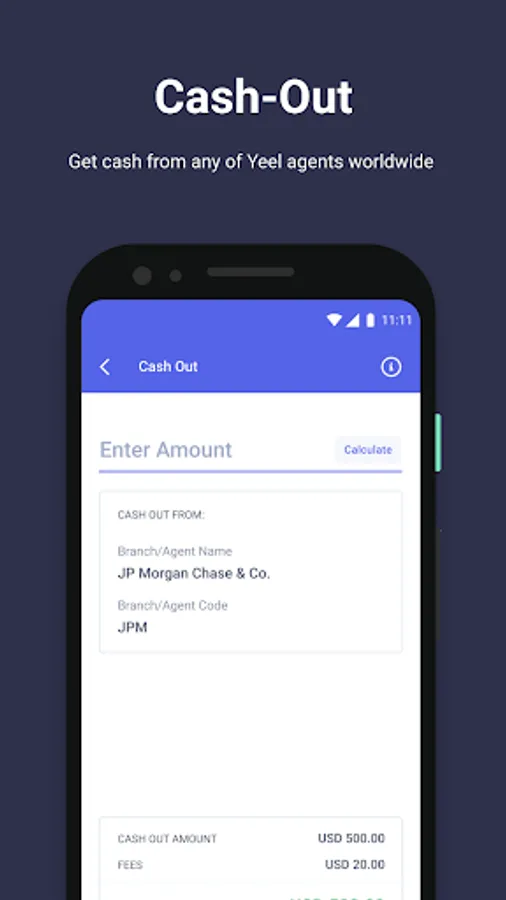 • Get access to your funds anywhere by using the cash-out feature at an authorized Yeel Agent worldwide.