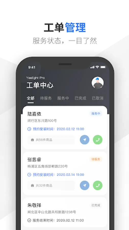 师傅可以管理易来线下服务商分配的工单,包括Yeelight Pro工单和普通工单。师傅可以通过工单,快速的联系用户,查看工单中用户下单的产品品类、数量,同时支持用户地址导航服务。