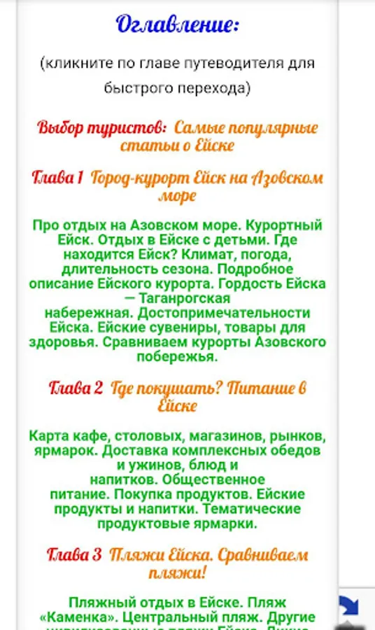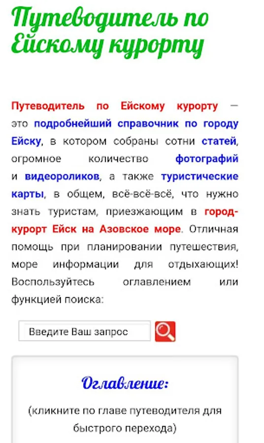The application will redirect you to one of the largest tourist sites of YeiskOtdykh.rf. The information of the reference and news site Yeisk24.rf is also used. Great help when planning a trip, a lot of information for vacationers!