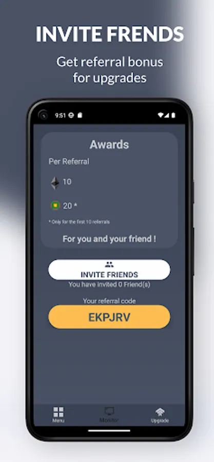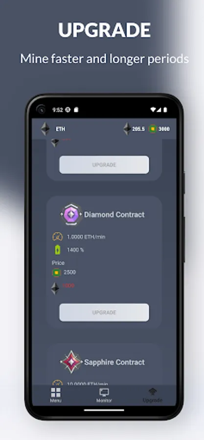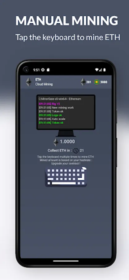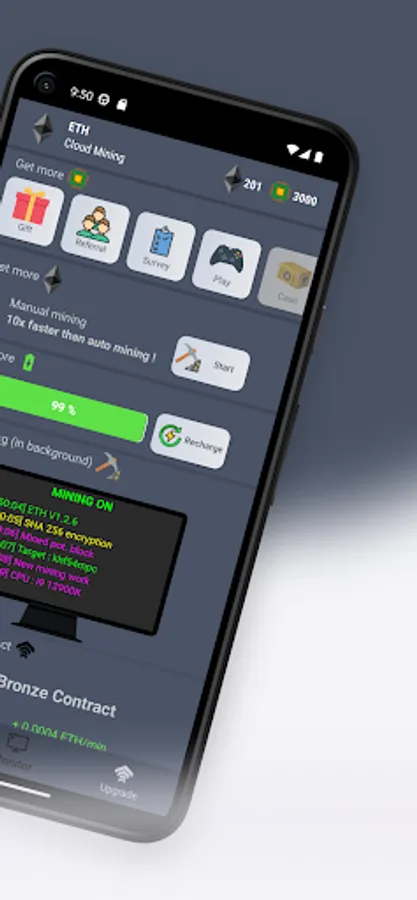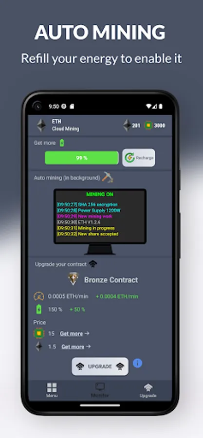 With Ethereum (ETH) mining simulation, you can track your mining progress in real time and exchange your earnings directly to your Ethereum (ETH) wallet. You can also upgrade your contract to mine ETH even faster and increase your profits. Plus, our app offers a referral program where you can earn additional ETH by inviting your friends and family to join.